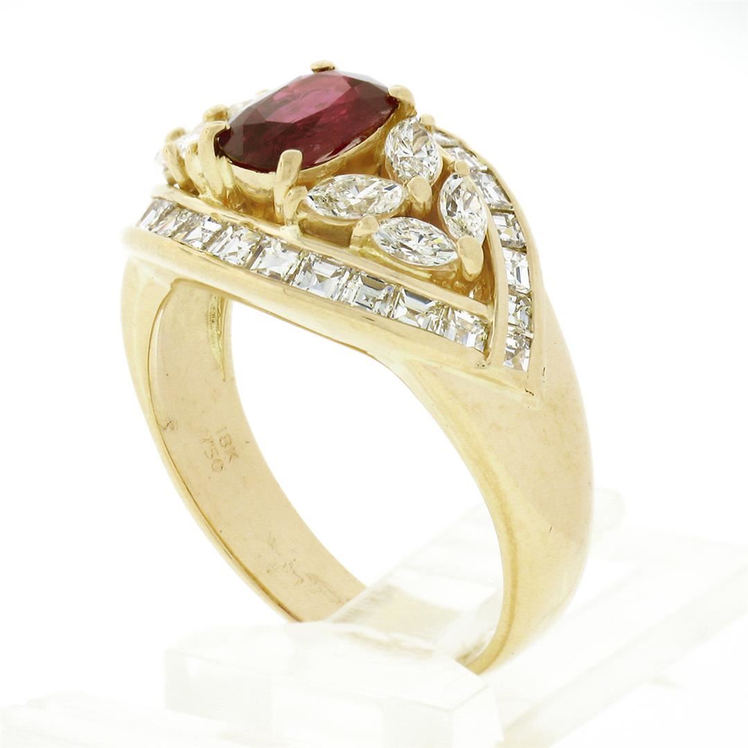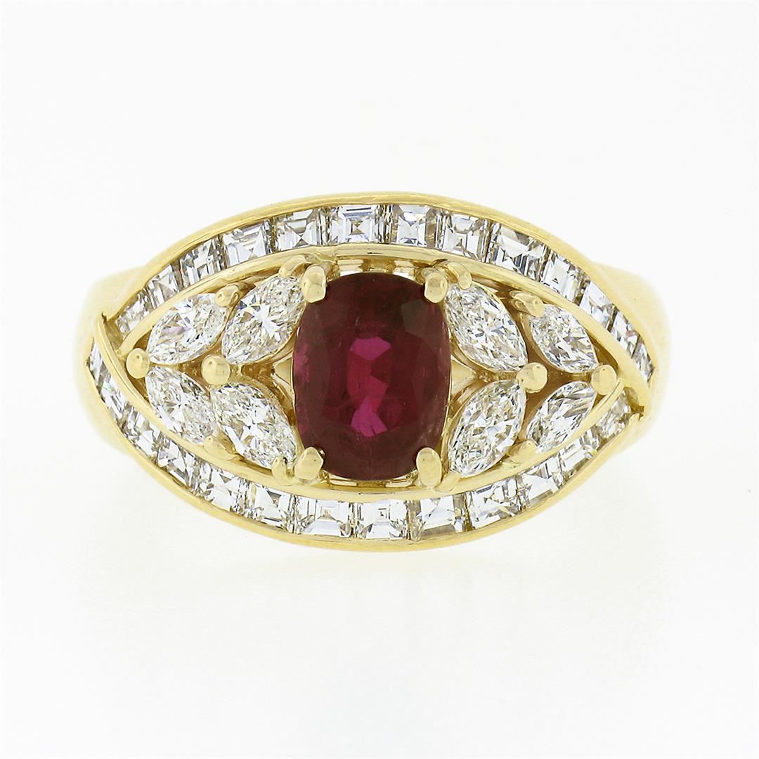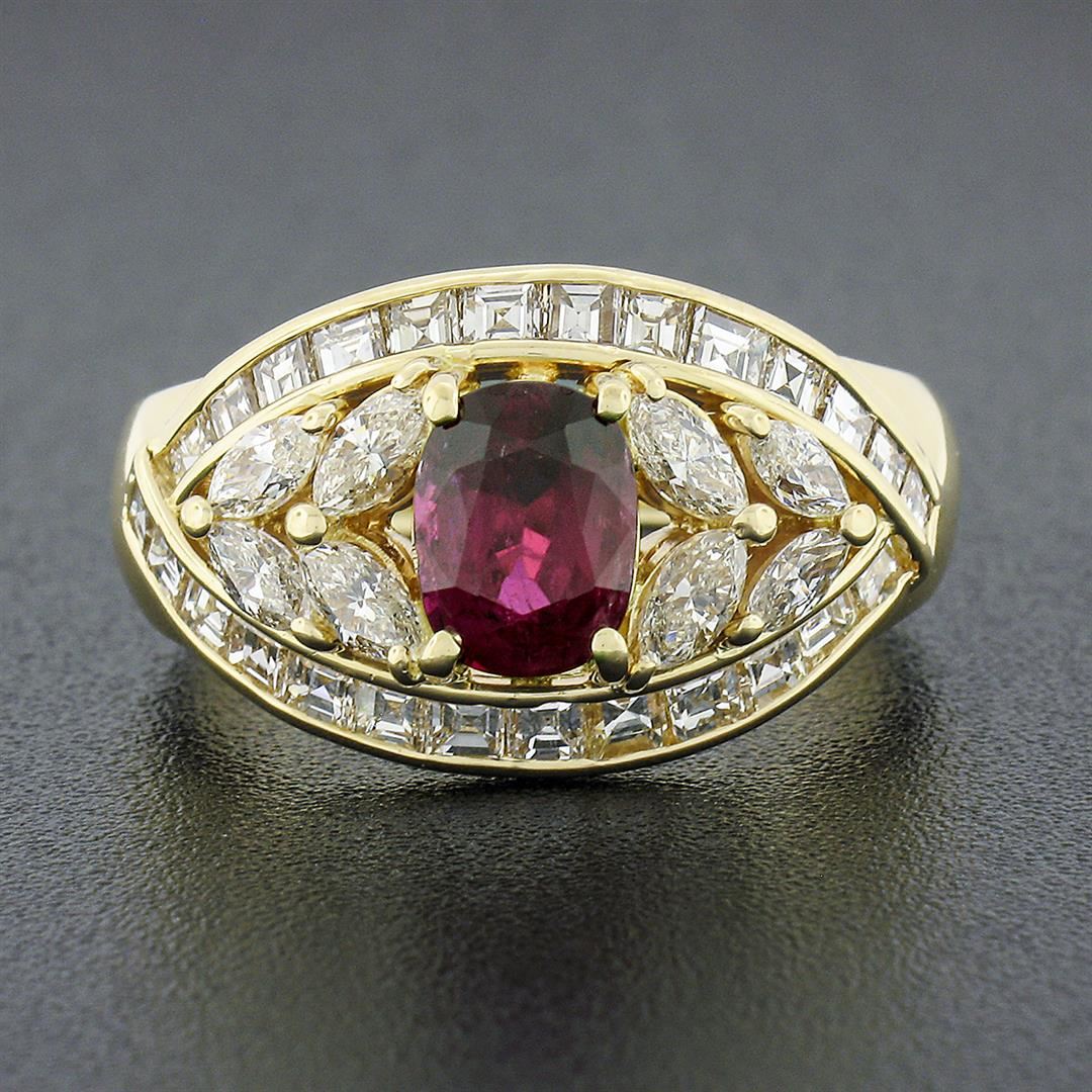 A solid 18k yellow gold statement ring, with 1 Gia certified ocal cut natural ruby (1.25ct), and 8 marquise cut natural diamonds (H/I - VS1/VS2 ; 1.0ctw), with 26 square step cut natural diamonds (F/G - VVS2/VS1 ; 1.56ctw). The ring is size 8.5, weighs a