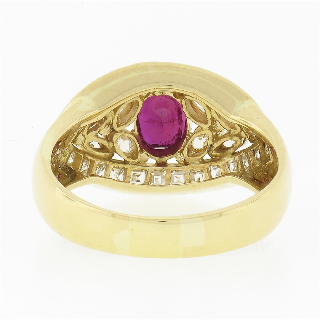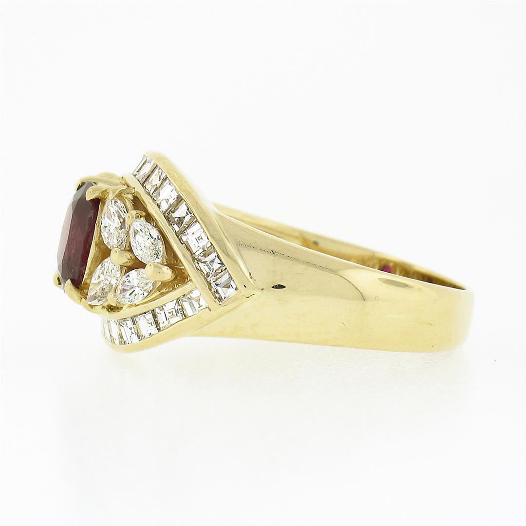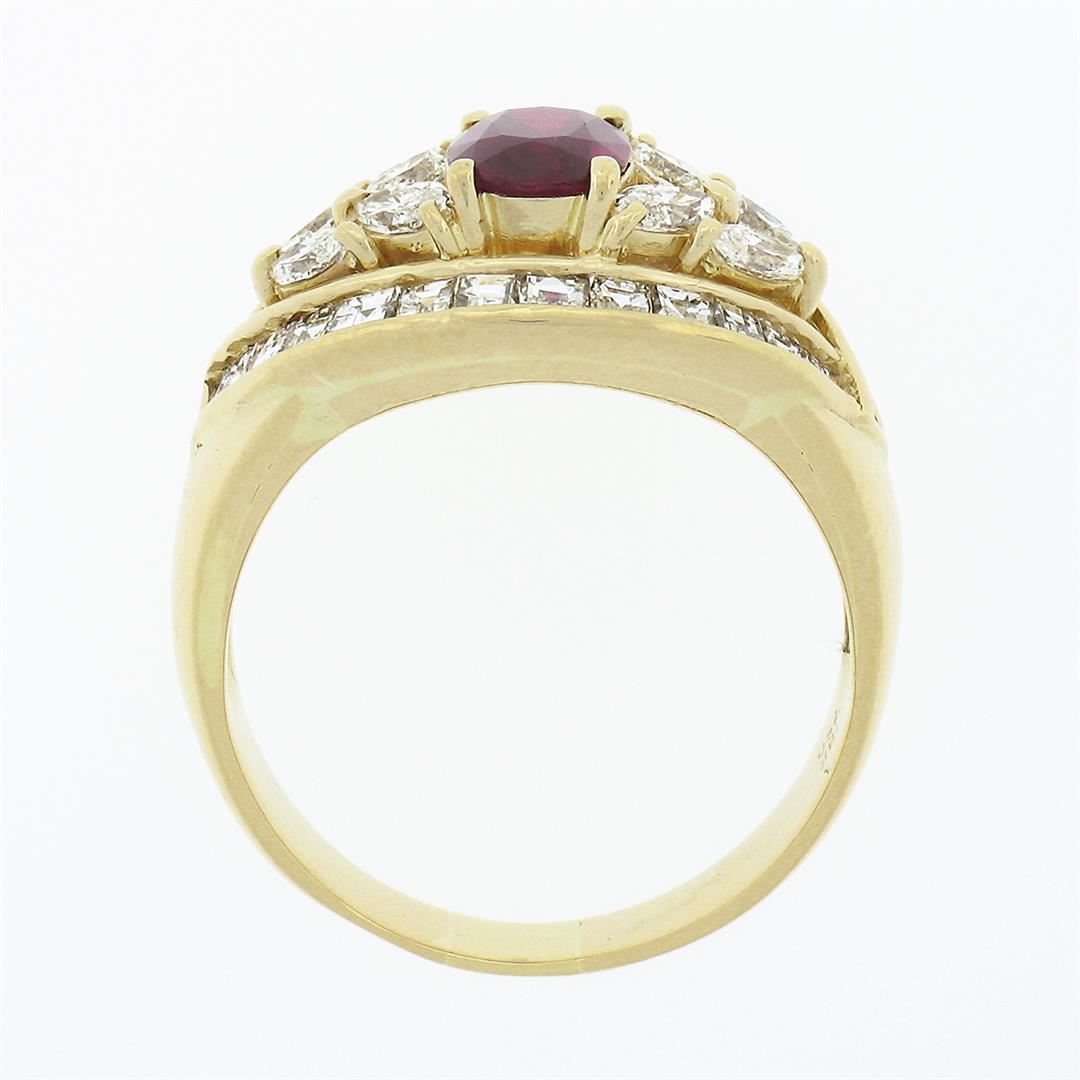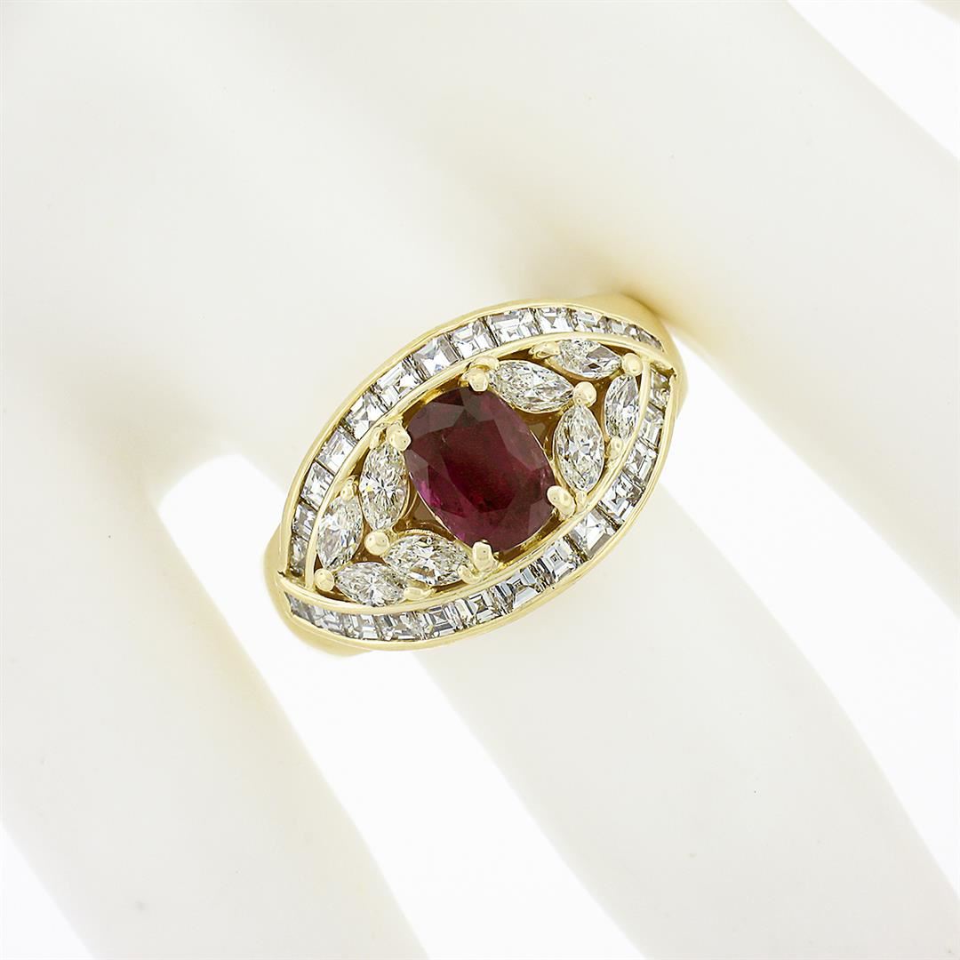 A solid 18k yellow gold statement ring, with 1 Gia certified ocal cut natural ruby (1.25ct), and 8 marquise cut natural diamonds (H/I - VS1/VS2 ; 1.0ctw), with 26 square step cut natural diamonds (F/G - VVS2/VS1 ; 1.56ctw). The ring is size 8.5, weighs a