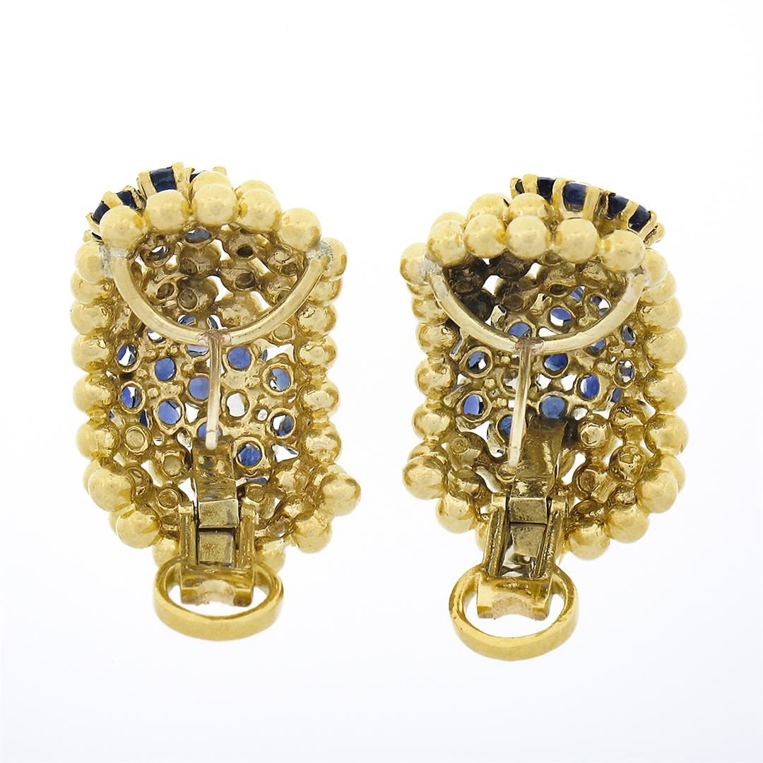 A vintage solid 18k yellow gold earrings, with 38 round brilliant cut natural sapphires (4.25ctw ), and 2 round brilliant cut natural diamonds (F/G - VS1/VS2 ; 0.42ctw). The earrings measure approximately 26.70x17.30mm and weigh a total of 30.70 grams.