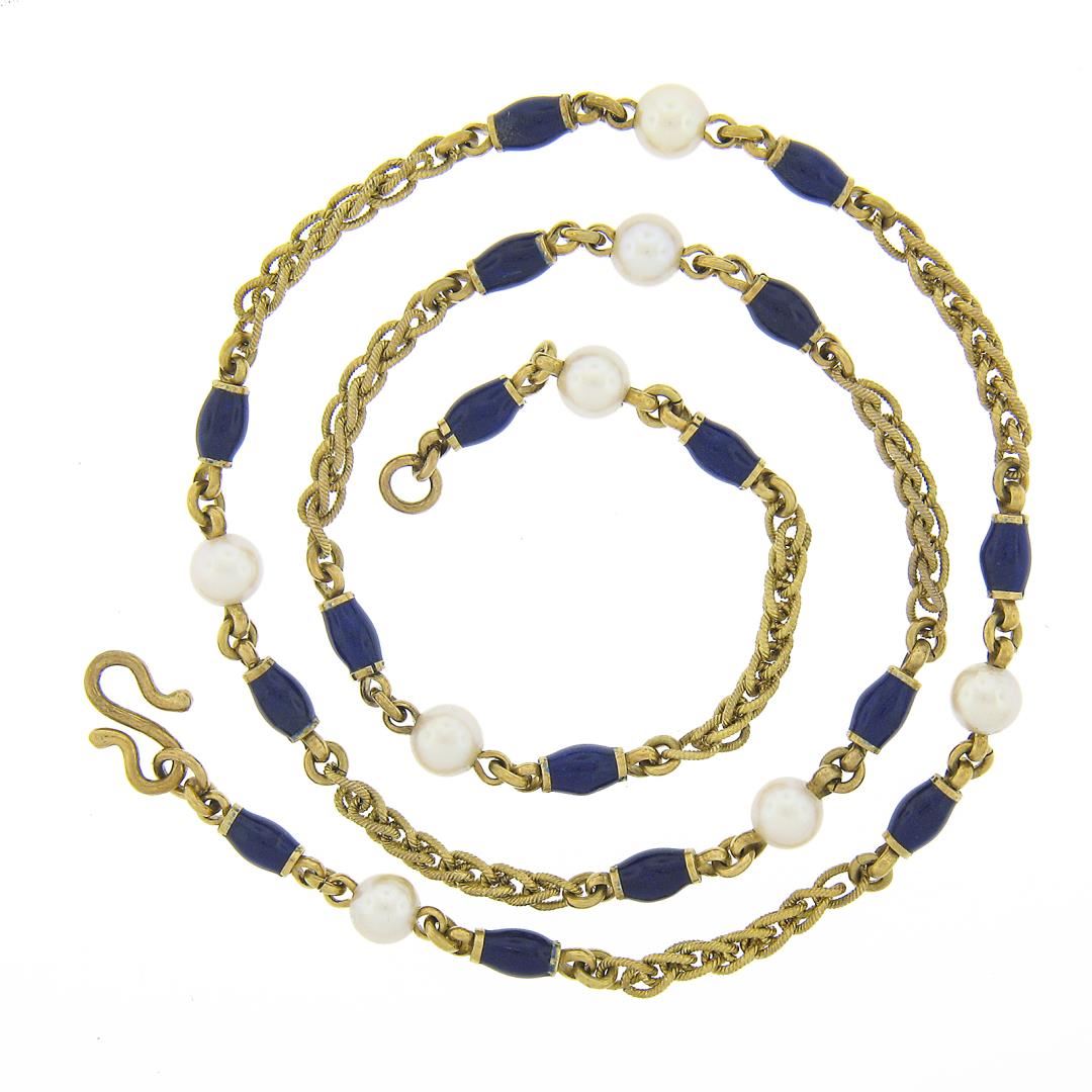 A vintage solid 18k yellow gold wheat link necklace, with blue enamel & 8 round cultured pearls (4.8mm). It weighs a total of 12.59 grams, measures 4.8mm wide, and measures 15.5 inches in length.