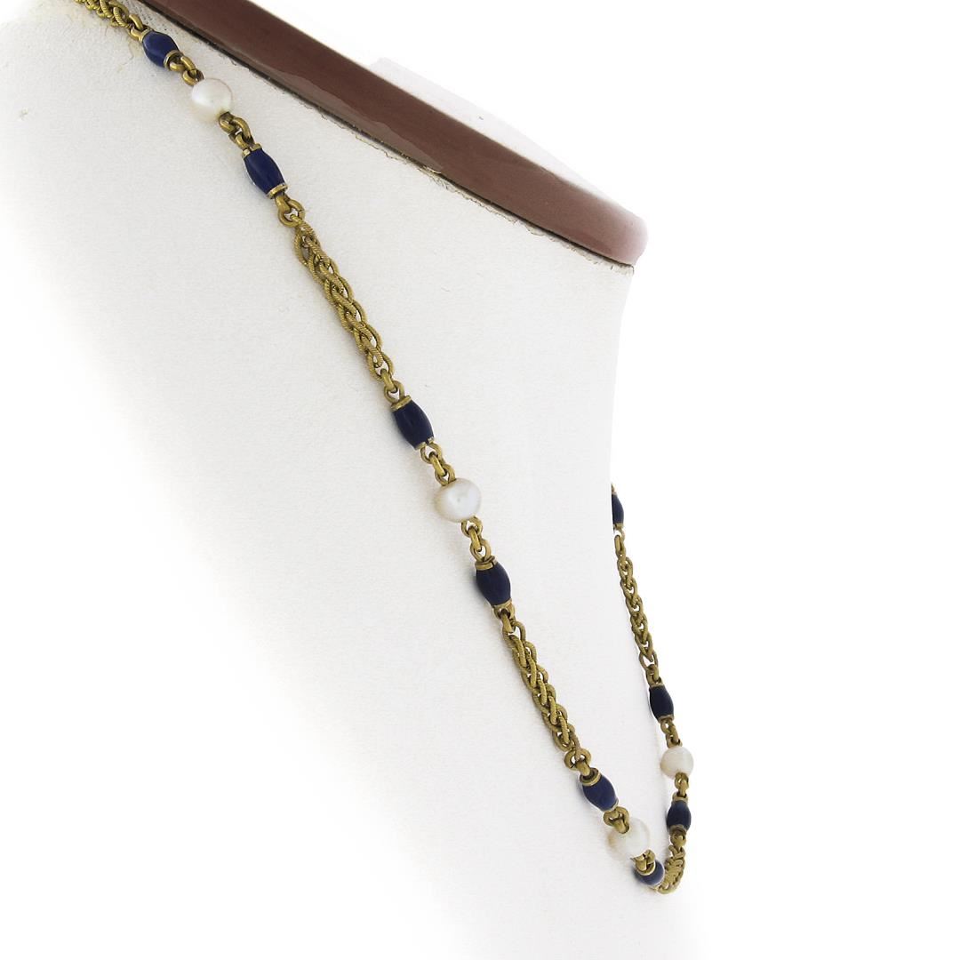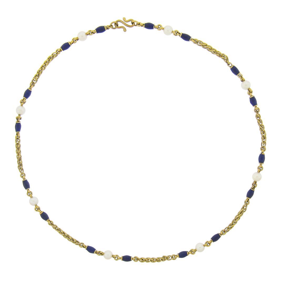 A vintage solid 18k yellow gold wheat link necklace, with blue enamel & 8 round cultured pearls (4.8mm). It weighs a total of 12.59 grams, measures 4.8mm wide, and measures 15.5 inches in length.
