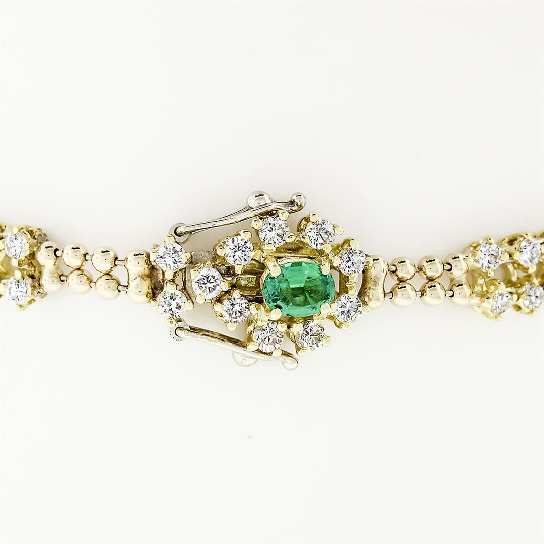 A vintage solid 18k yellow gold mesh chain bracelet, with 6 oval cut natural emeralds (2.58ctw), and 127 round brilliant cut natural diamonds (5.1ctw). It weighs a total of 18.48 grams, measures 15.35mm wide, and measures 7 inches in length.