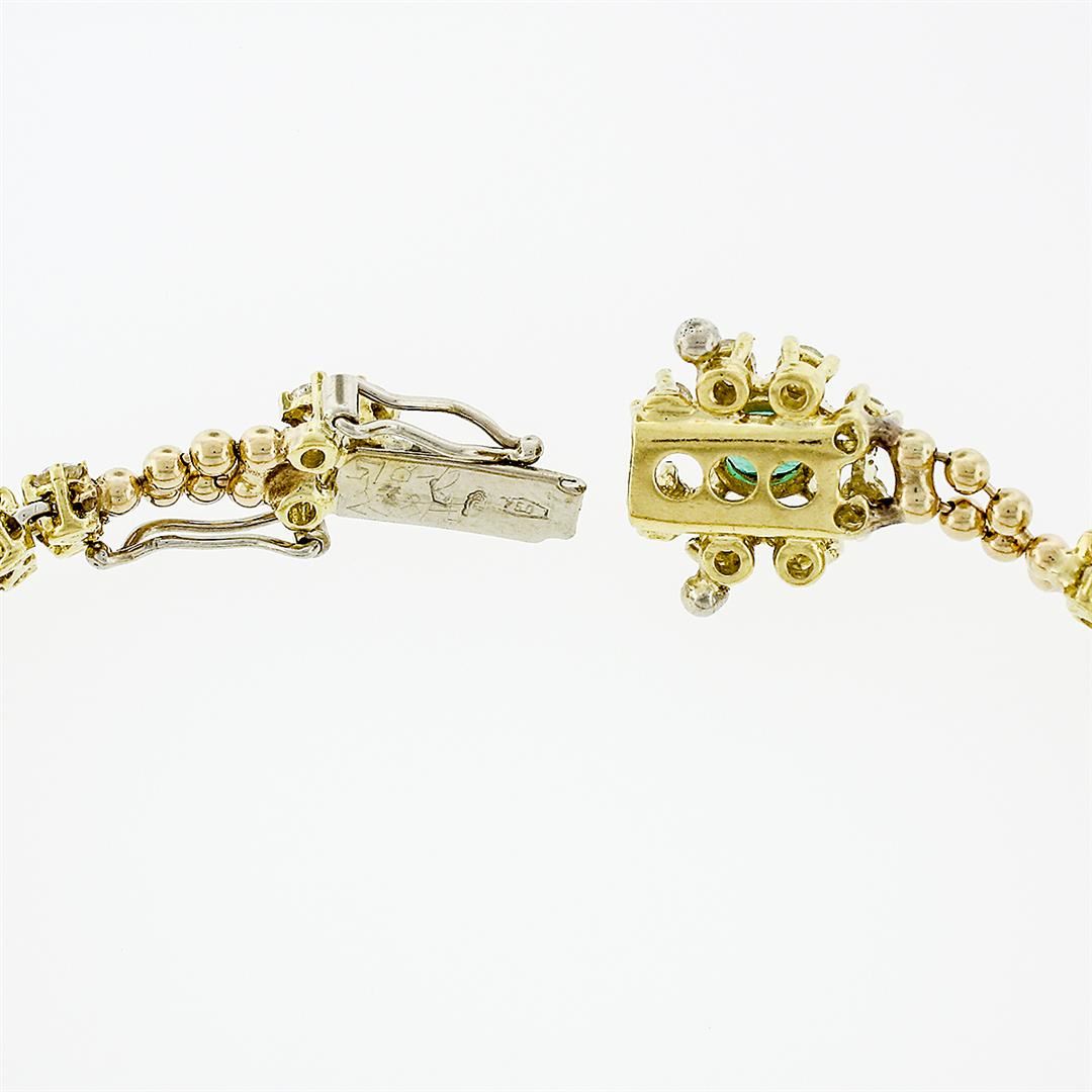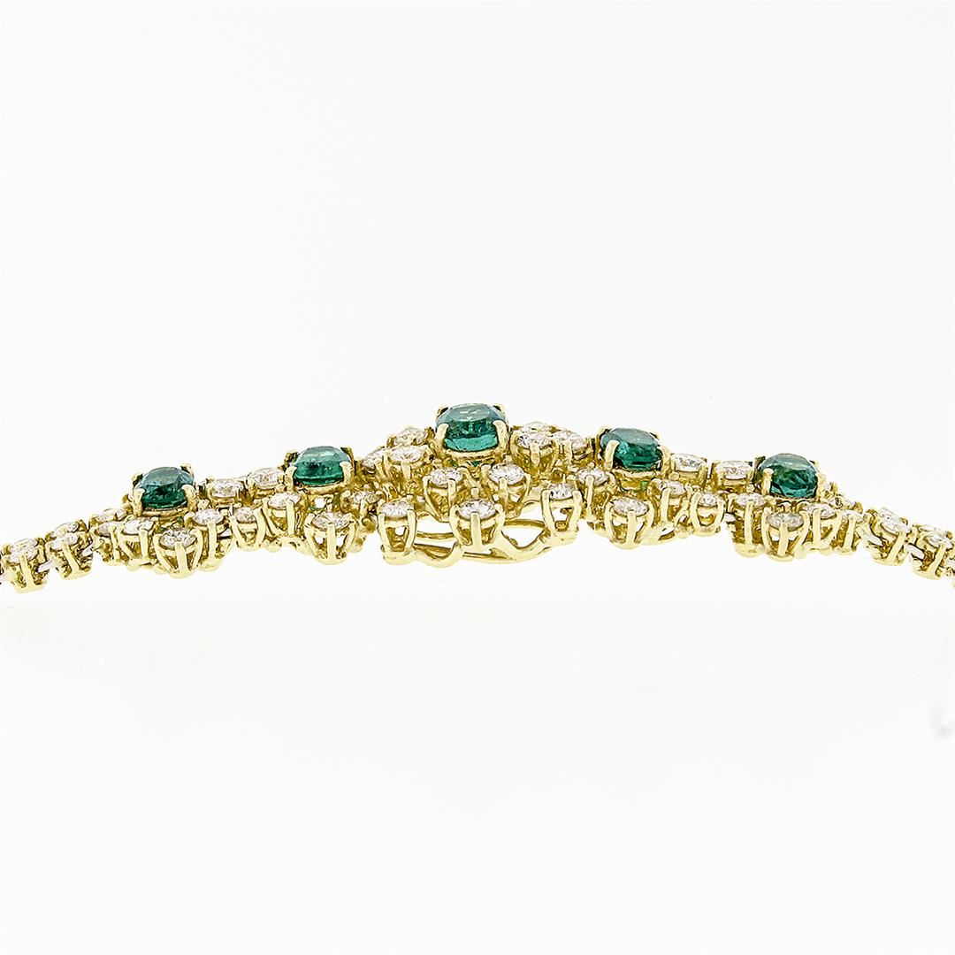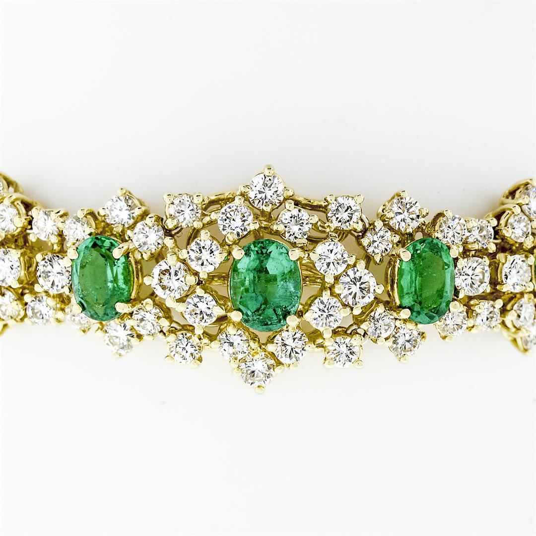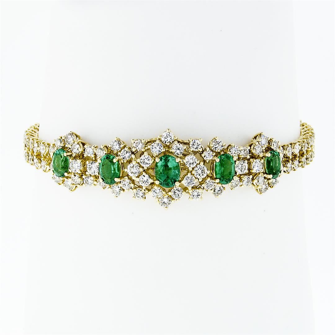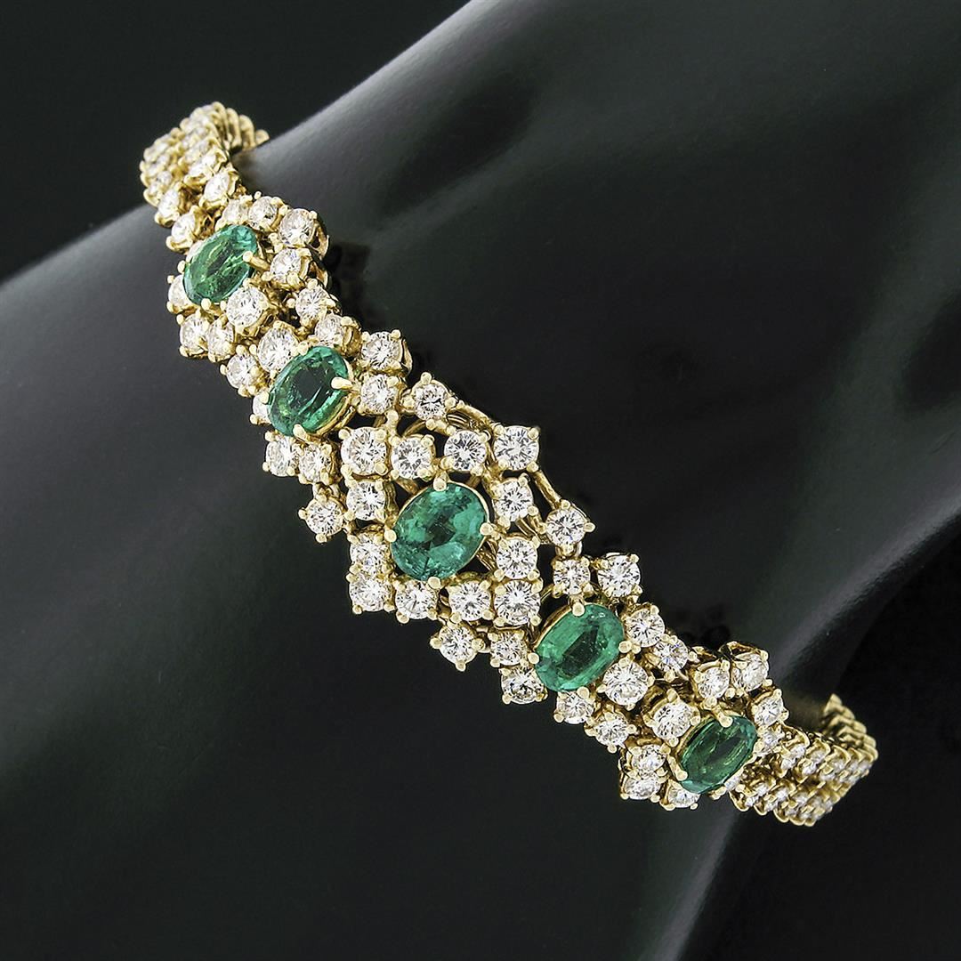 A vintage solid 18k yellow gold mesh chain bracelet, with 6 oval cut natural emeralds (2.58ctw), and 127 round brilliant cut natural diamonds (5.1ctw). It weighs a total of 18.48 grams, measures 15.35mm wide, and measures 7 inches in length.