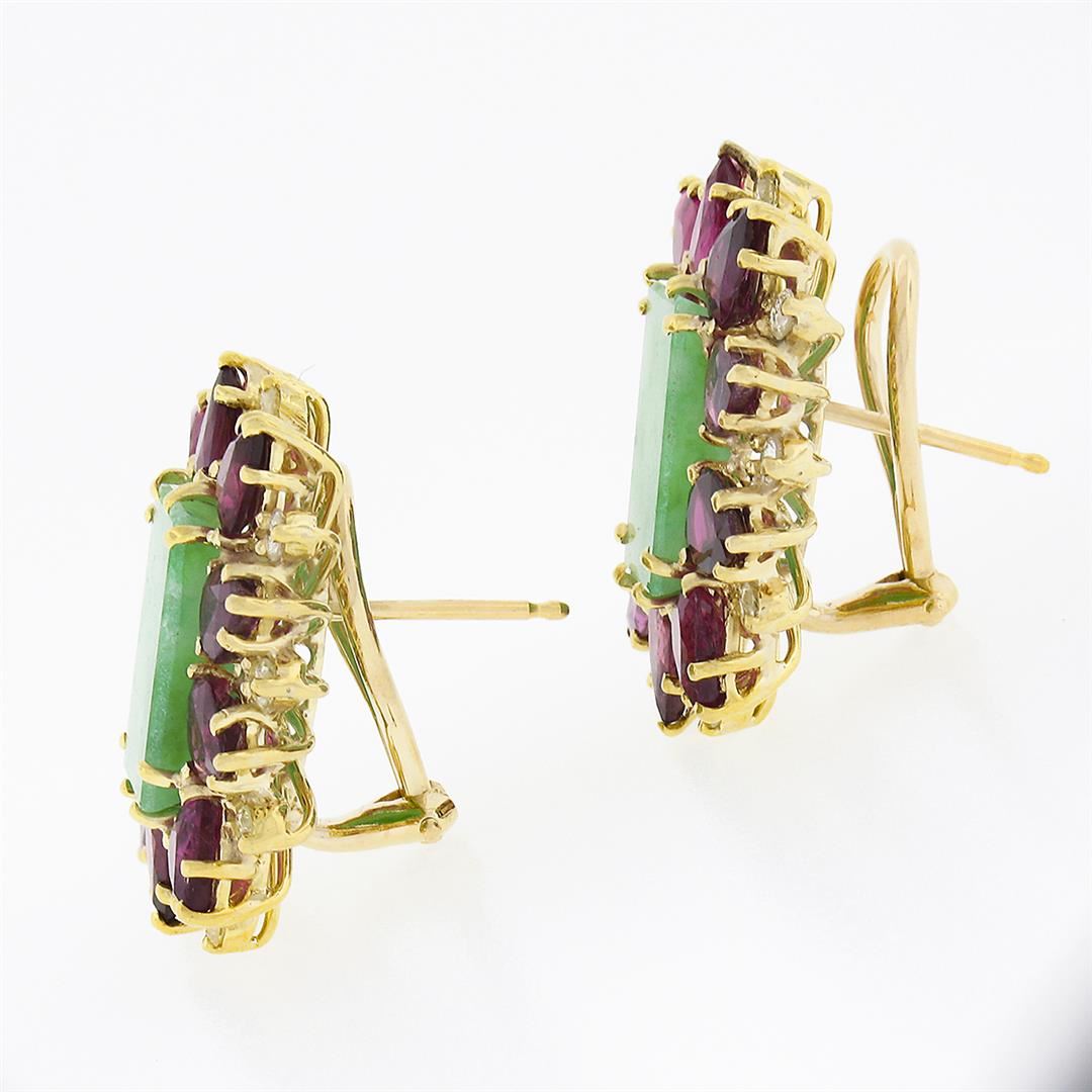 A vintage solid 18k yellow gold pair od earrings, featuring 2 rectangular cut natural jade (13.0x7.4mm each), surrounded with 20 pear cut natural rubies (8.0ctw ), and 20 round brilliant cut natural diamonds (I/J - SI1/SI2 ; 0.60ctw). The earrings measure approximately 25.90x20.80mm and weigh a total of 15.43 grams.
