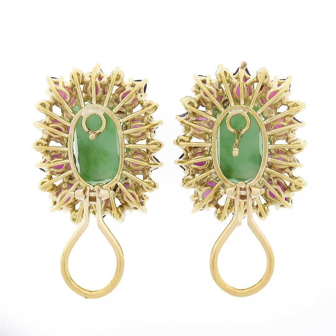 A vintage solid 18k yellow gold pair od earrings, featuring 2 rectangular cut natural jade (13.0x7.4mm each), surrounded with 20 pear cut natural rubies (8.0ctw ), and 20 round brilliant cut natural diamonds (I/J - SI1/SI2 ; 0.60ctw). The earrings measure approximately 25.90x20.80mm and weigh a total of 15.43 grams.
