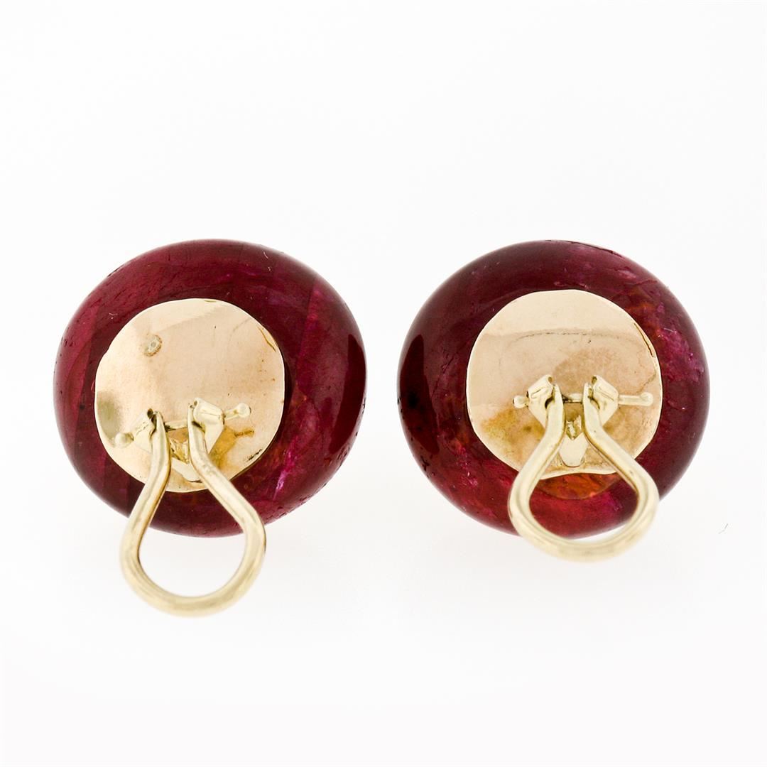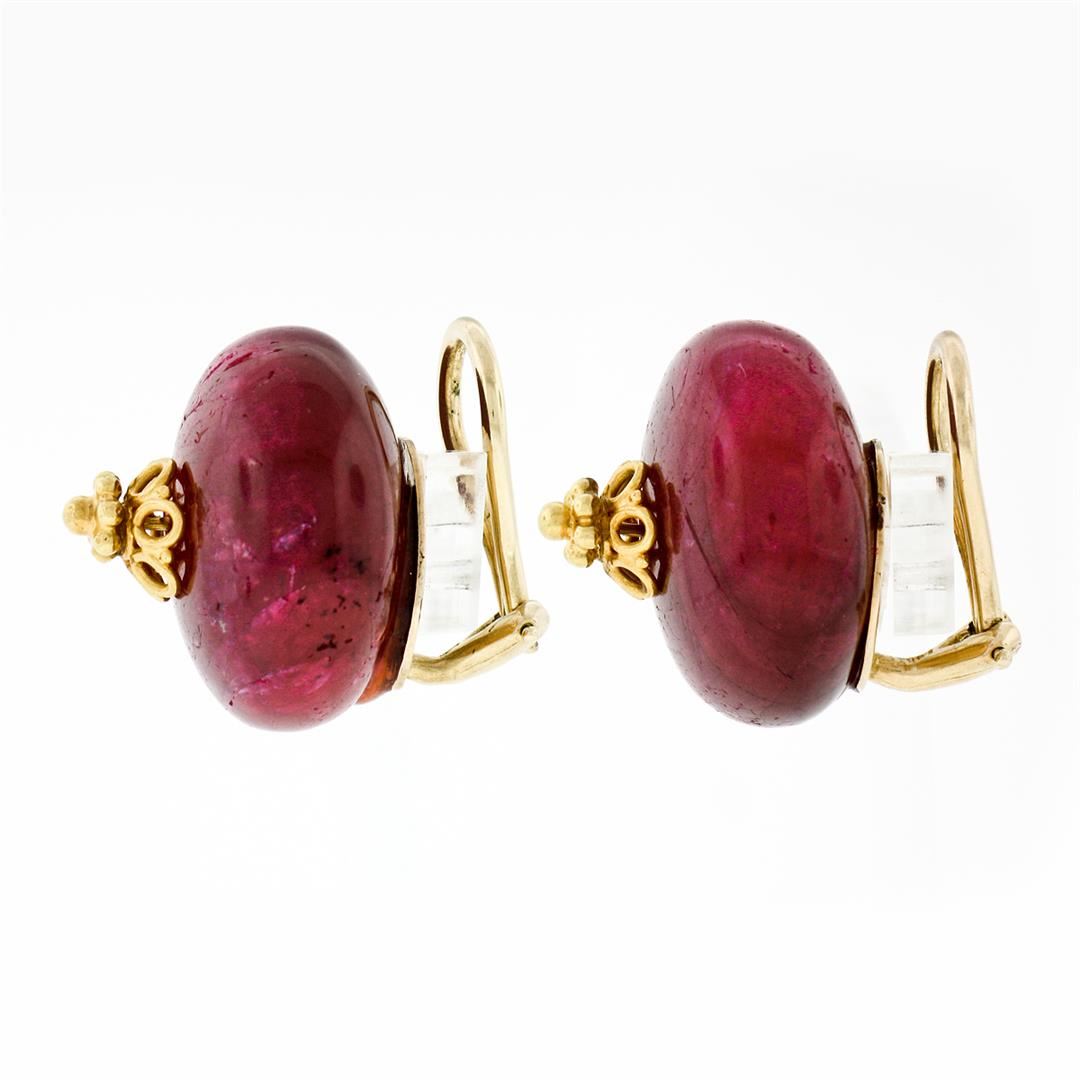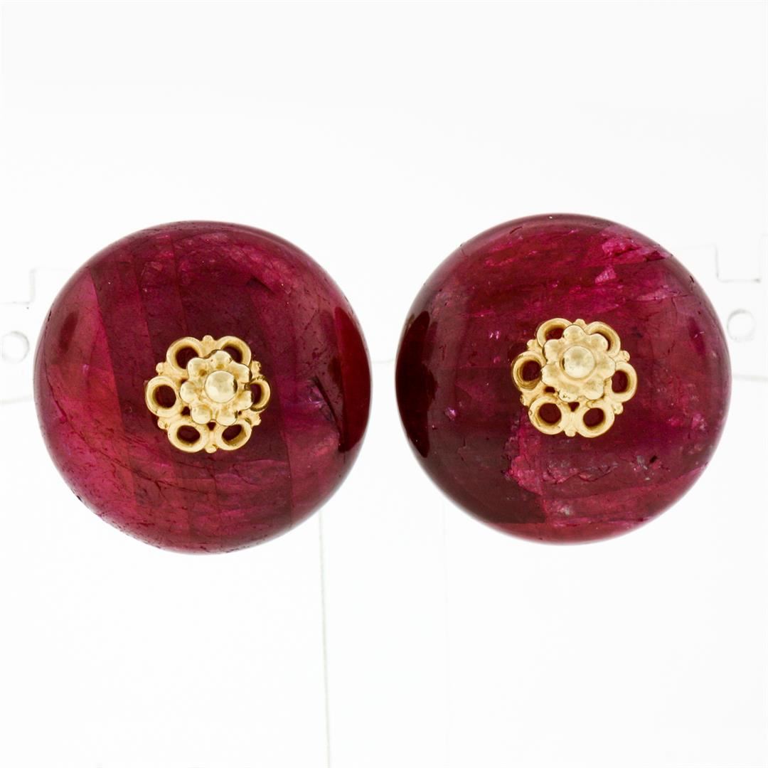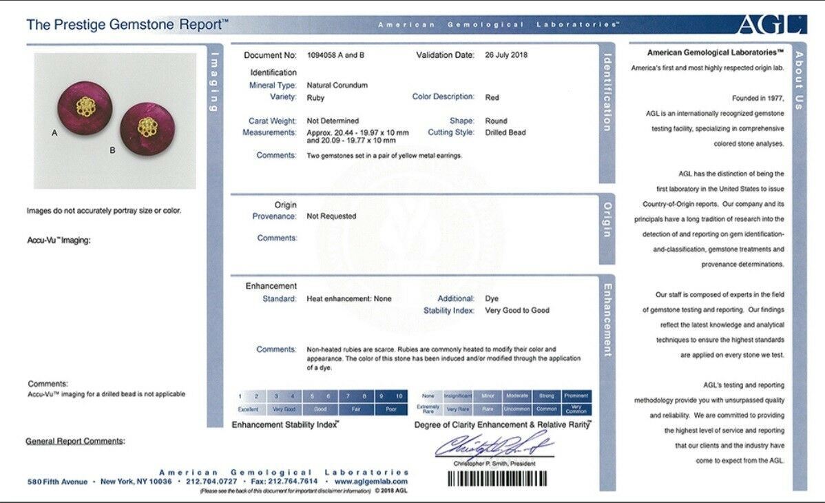 A vintage pair of solid yellow gold button clip on earrings, 2 AGL certified round drilled bead natural rubies (20.44-19.97mm & 20.09-19.77mm). The earrings measure approximately 20mm in diameter and weigh a total of 24.2 grams. Comes with all original relevant certifications.