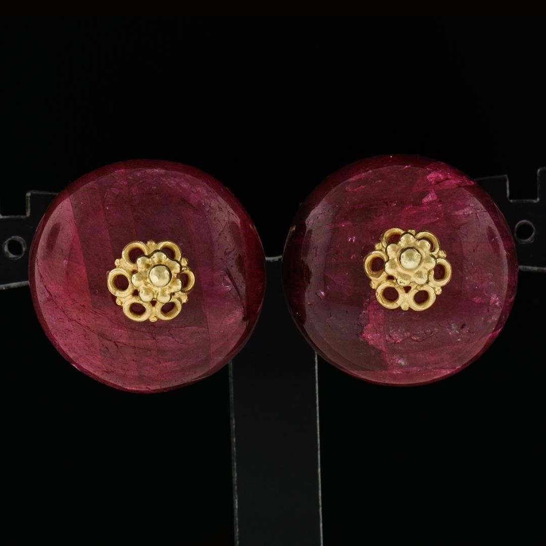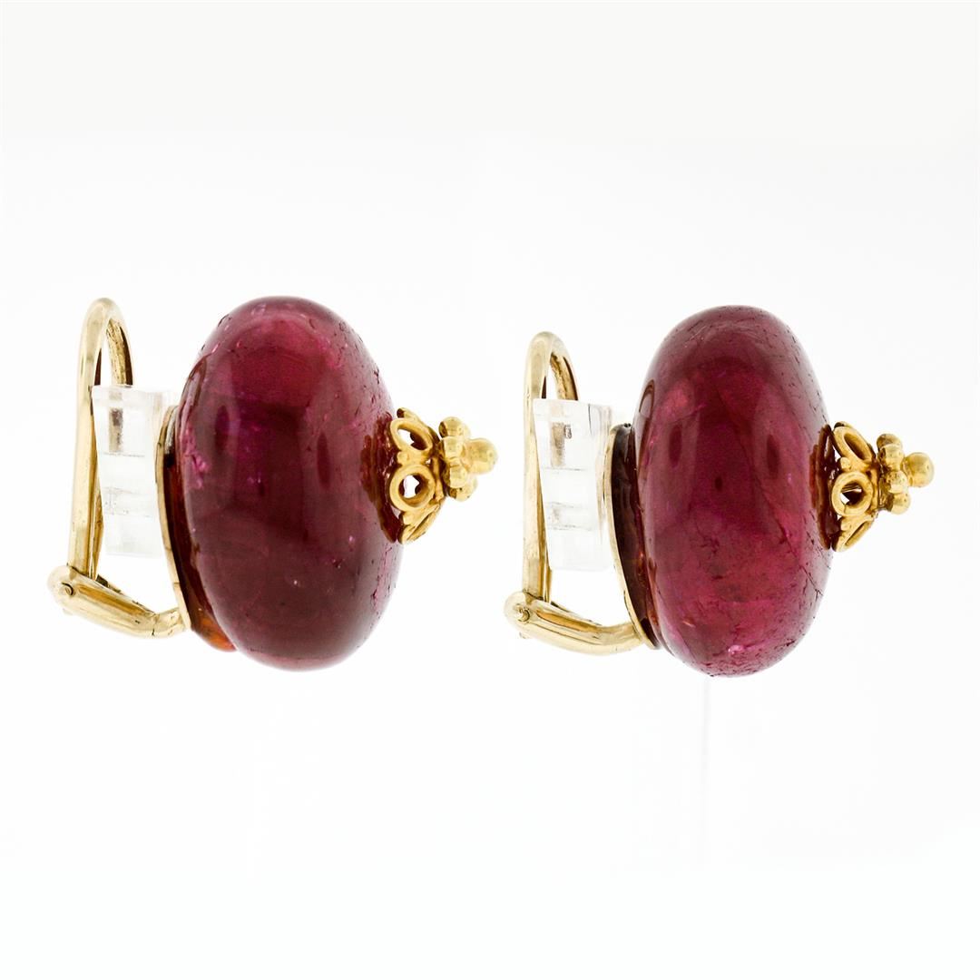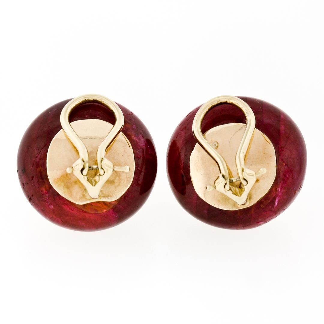 A vintage pair of solid yellow gold button clip on earrings, 2 AGL certified round drilled bead natural rubies (20.44-19.97mm & 20.09-19.77mm). The earrings measure approximately 20mm in diameter and weigh a total of 24.2 grams. Comes with all original relevant certifications.