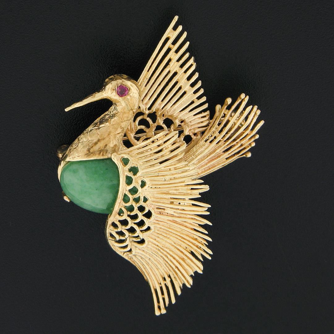 A vintage solid 18k yellow gold bird brooch, with 1 oval cabochon cut natural jade (15.5x12.2mm), and 1 round brilliant cut natural ruby (0.03ct). Measures 53x34.6mm and weighs a total of 9.96 grams.