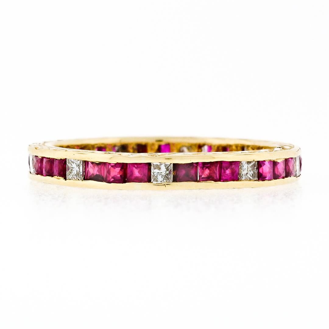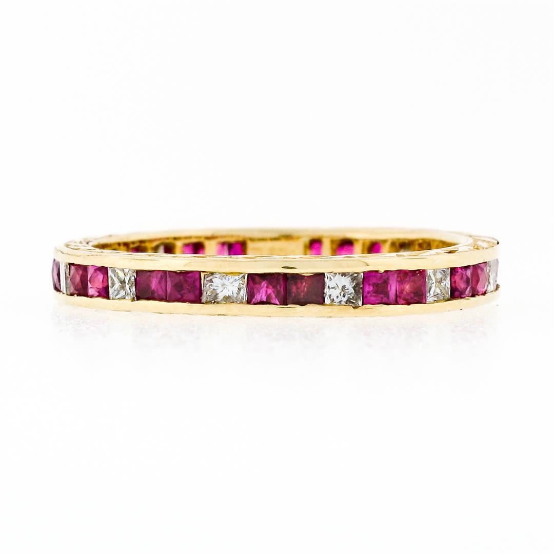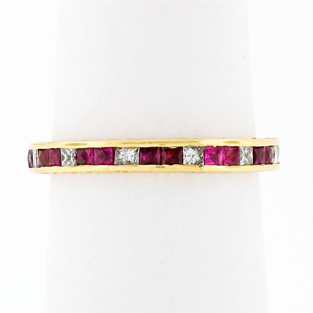 A vintage solid 18k yellow gold eternity band ring, with 26 french square cut natural rubies (0.85ctw), and 11 square cut natural diamonds (F/G - VS1/VS2 ; 0.30ctw).The ring is size 5.5, weighs a total of 1.90 grams, and measures 2.65mm wide.