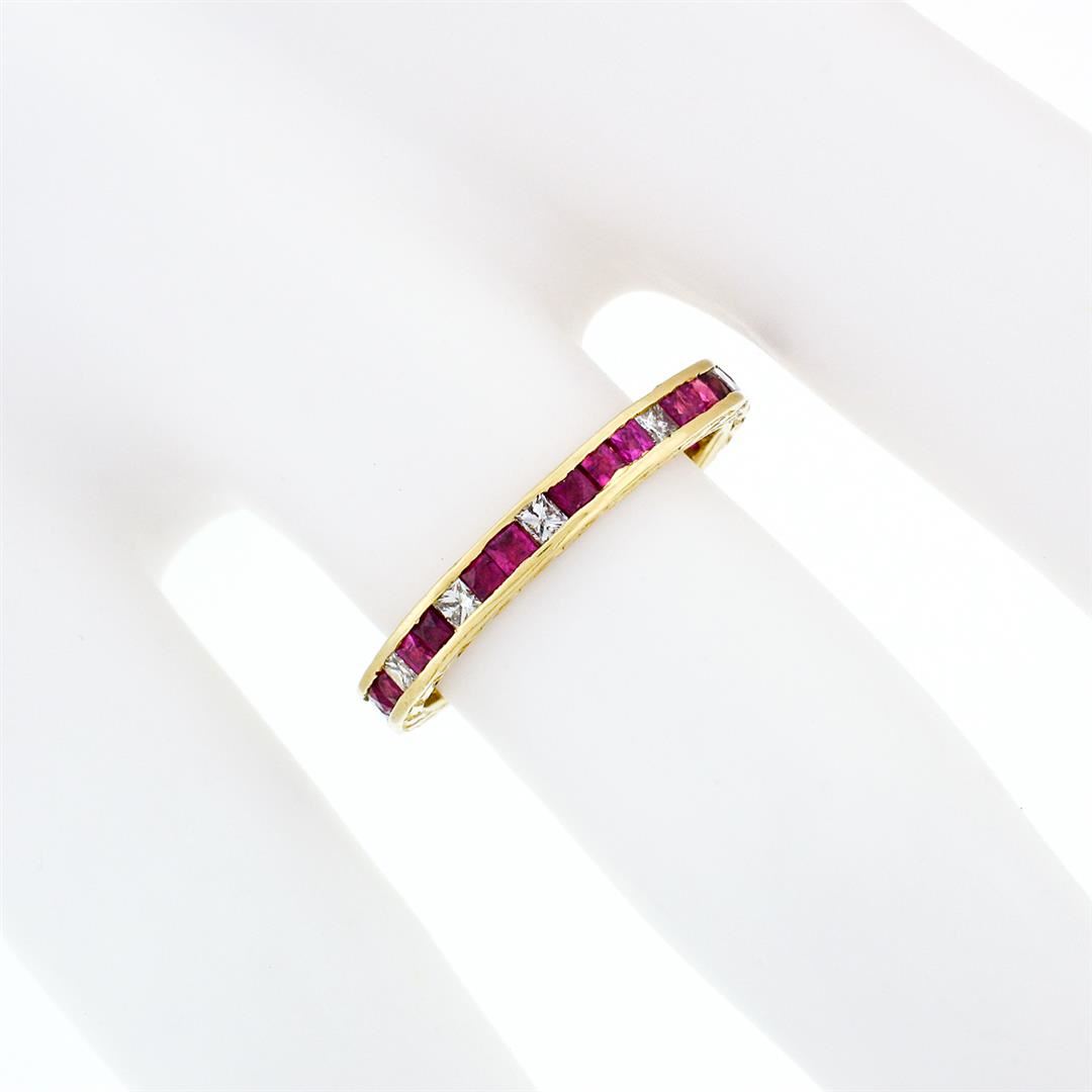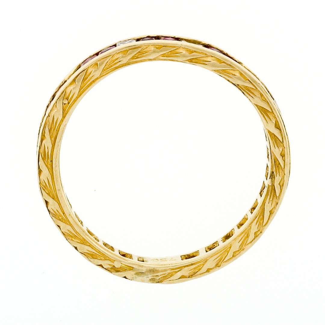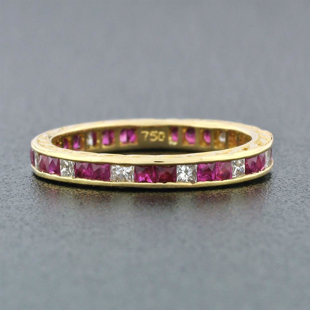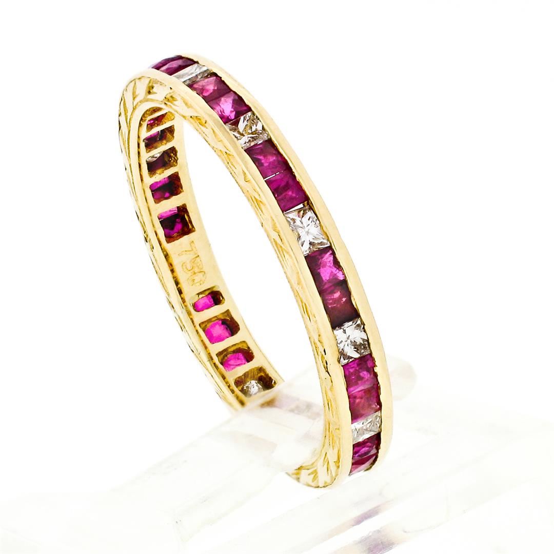 A vintage solid 18k yellow gold eternity band ring, with 26 french square cut natural rubies (0.85ctw), and 11 square cut natural diamonds (F/G - VS1/VS2 ; 0.30ctw).The ring is size 5.5, weighs a total of 1.90 grams, and measures 2.65mm wide.