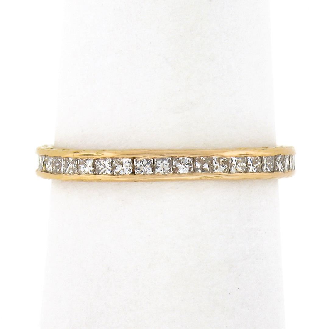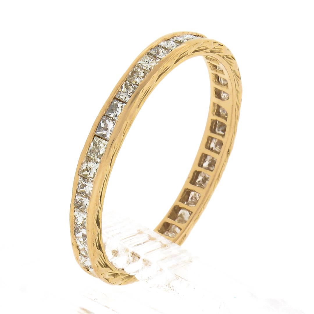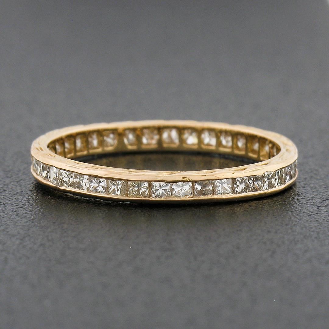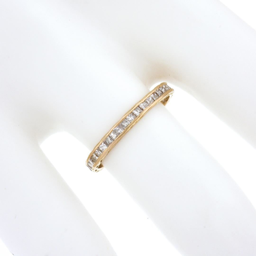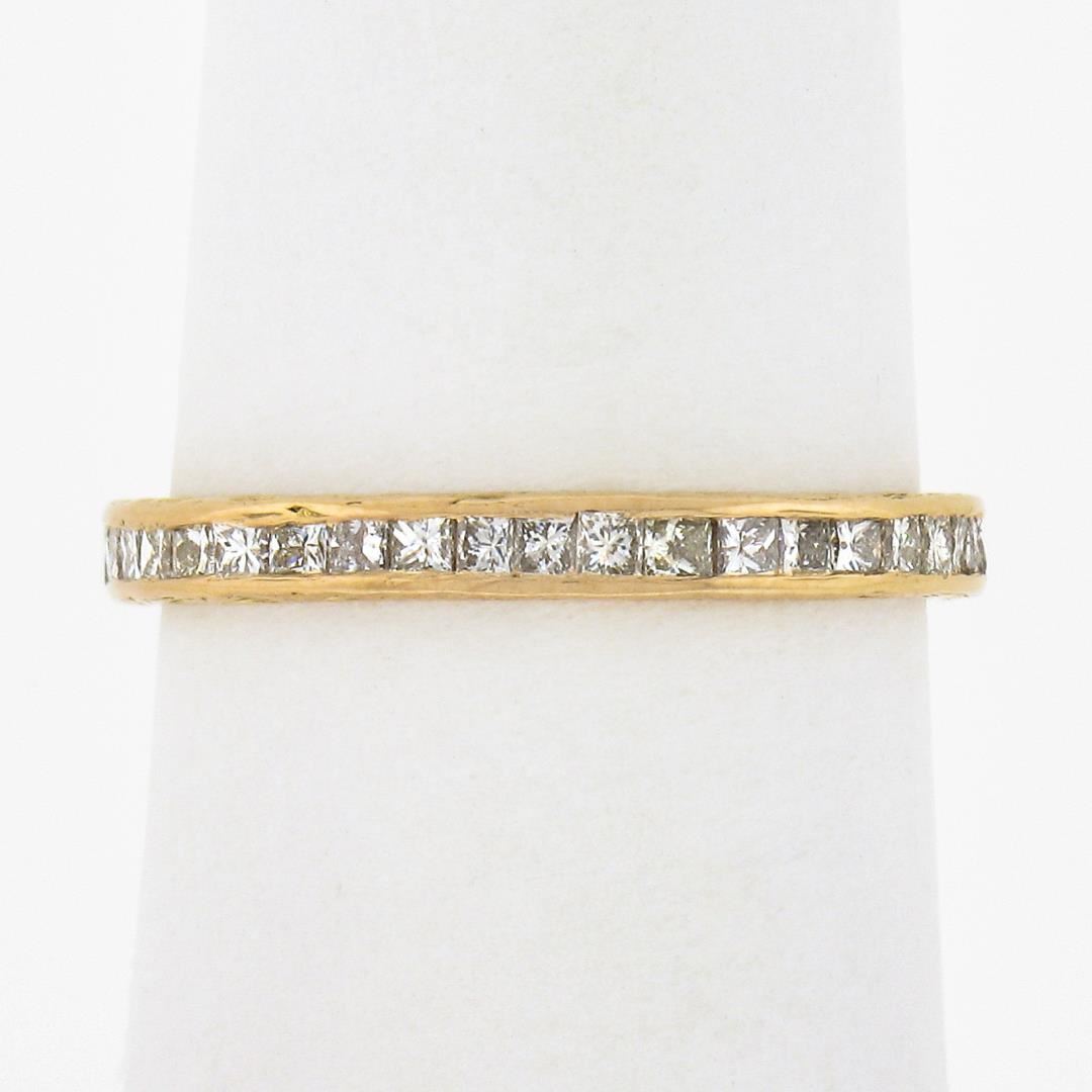 A vintage solid 18k yellow gold ring, with numerous of princess cut natural diamonds (H/J - VS2/SI1 ; 0.75cwt ). The ring is size 5.5, weighs a total of 1.12 grams, and measures 2.30mm wide.
