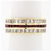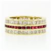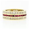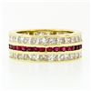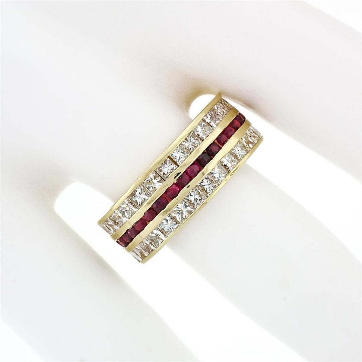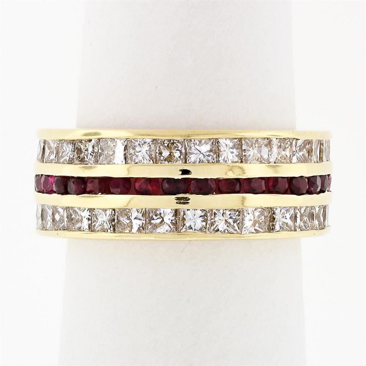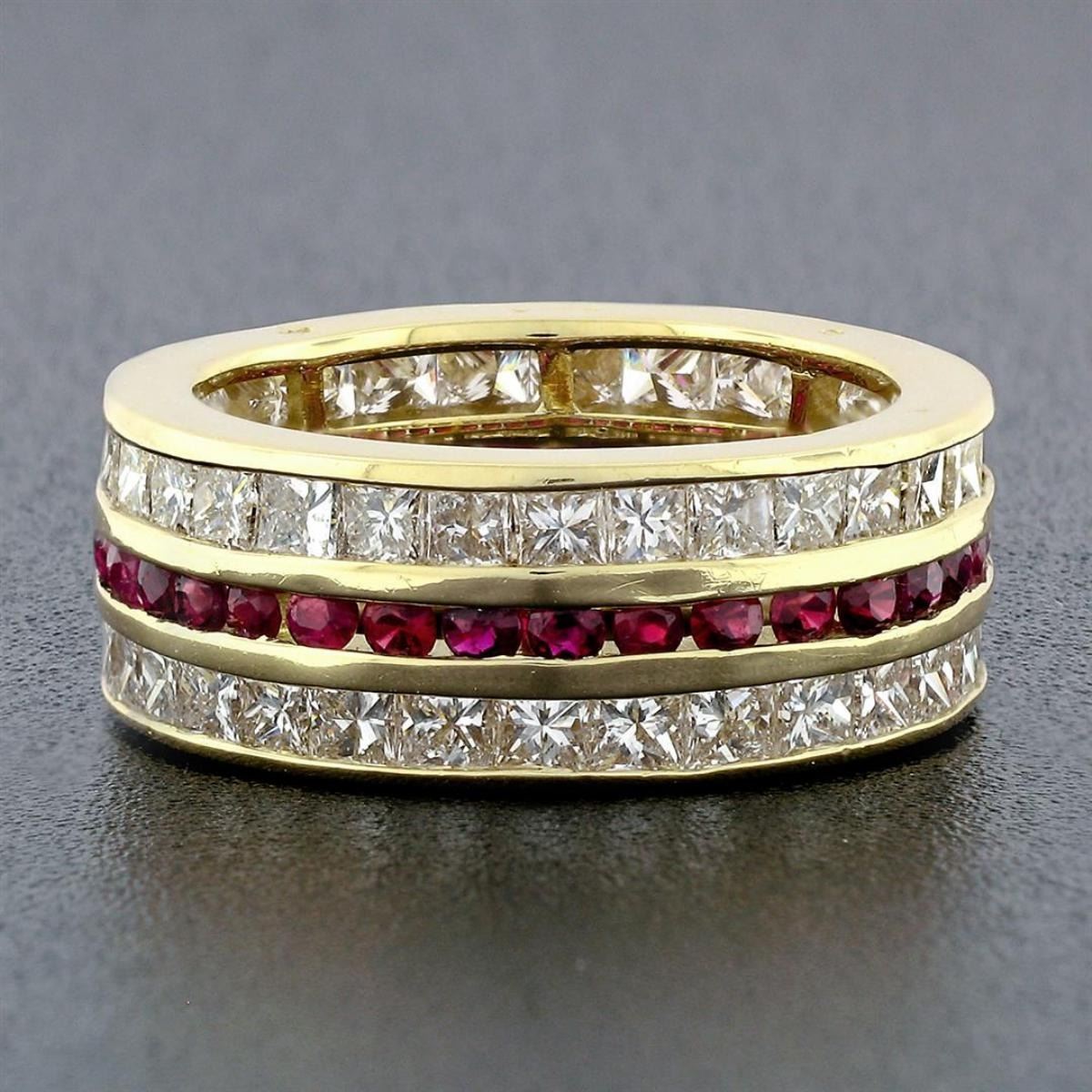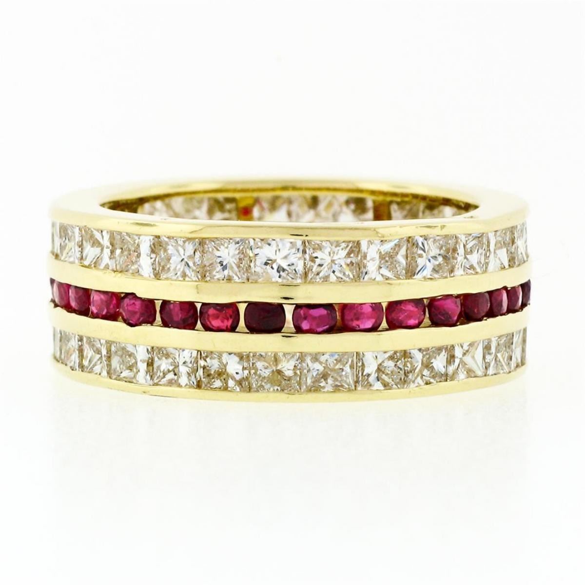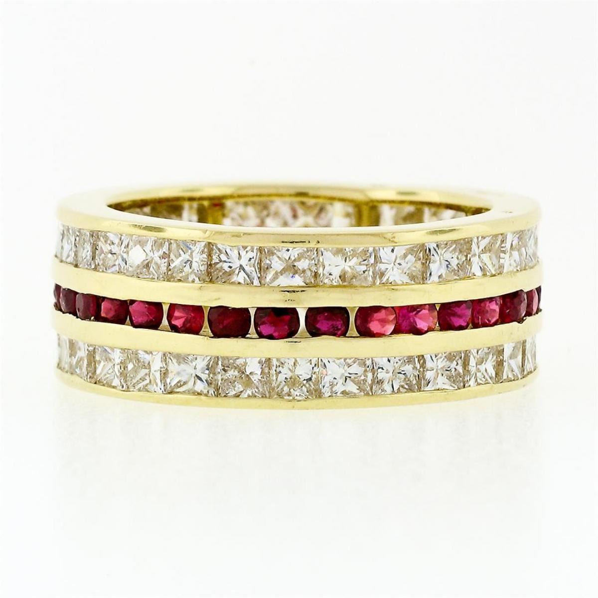 A solid 18k yellow gold eternity band ring, with 33 round brilliant cut natural rubies (1.0ctw), and 58 square princess cut natural diamonds (H/I C- VS1/VS2 ; 4.0ctw). The ring is size 6.0, weighs a total of 7.11 grams, and measures 7.7mm wide.