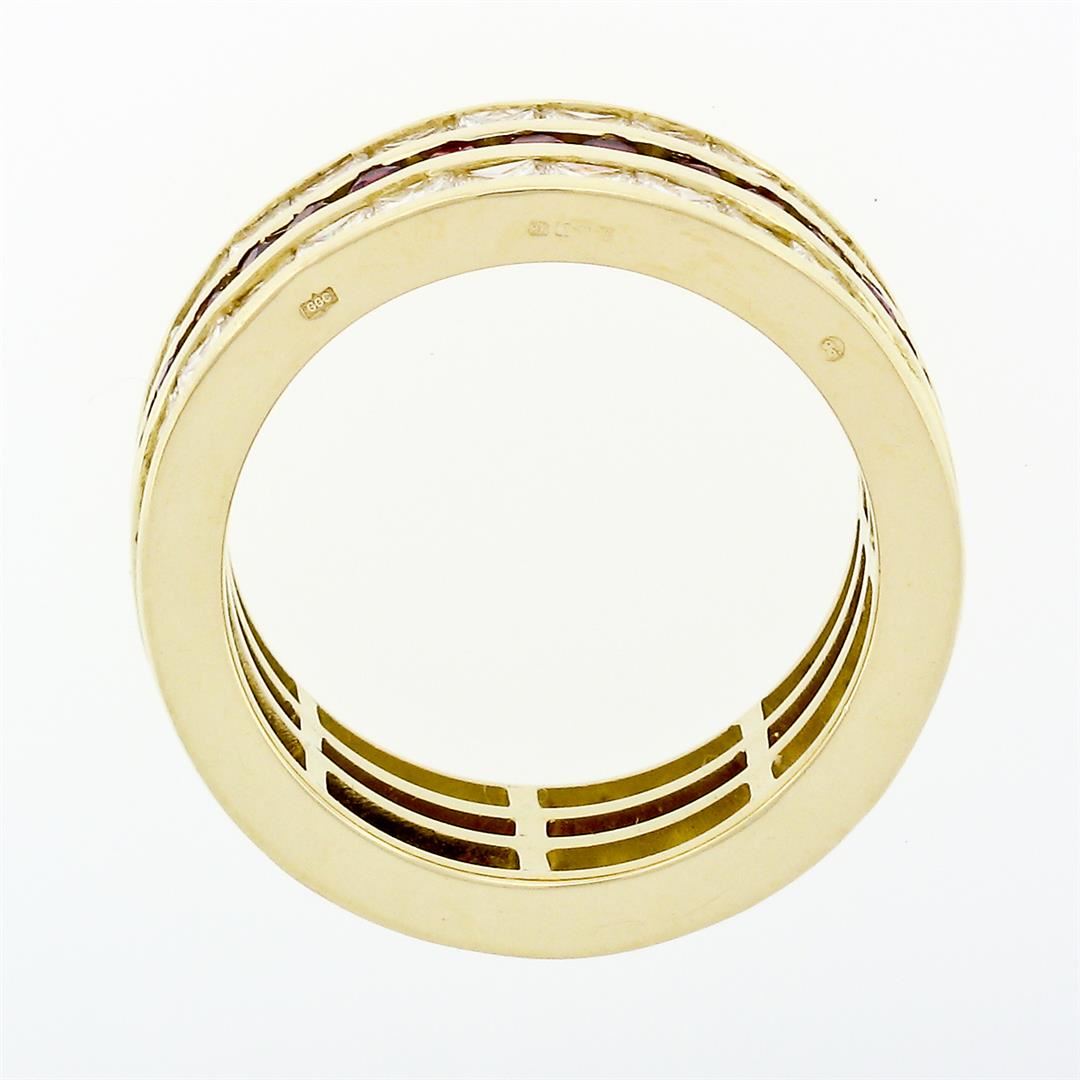 A solid 18k yellow gold eternity band ring, with 33 round brilliant cut natural rubies (1.0ctw), and 58 square princess cut natural diamonds (H/I C- VS1/VS2 ; 4.0ctw). The ring is size 6.0, weighs a total of 7.11 grams, and measures 7.7mm wide.