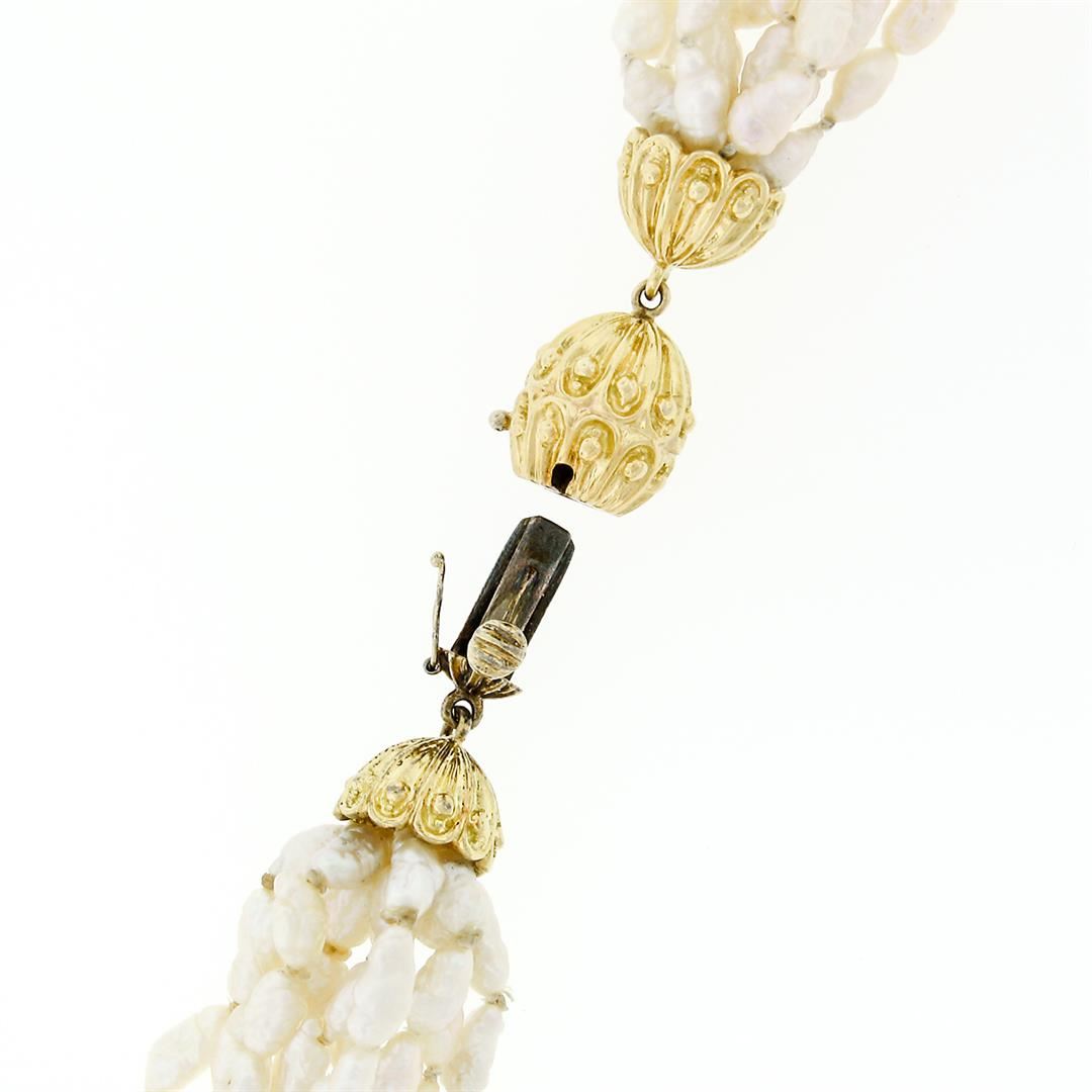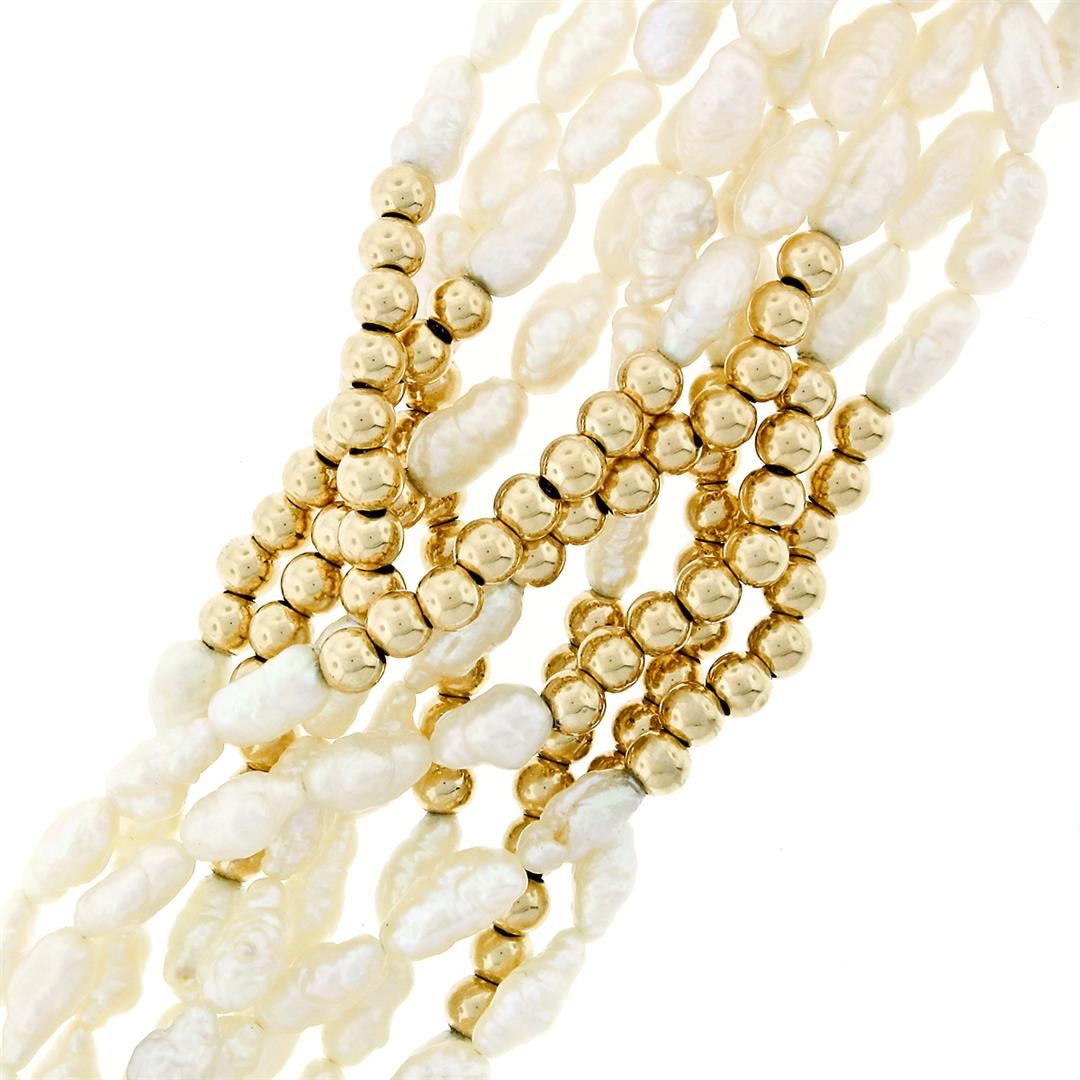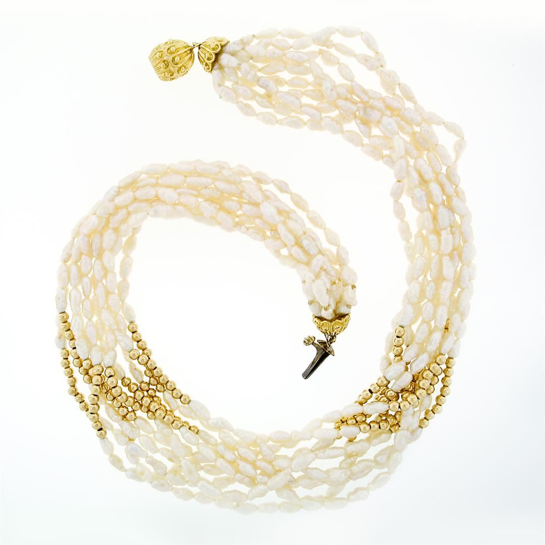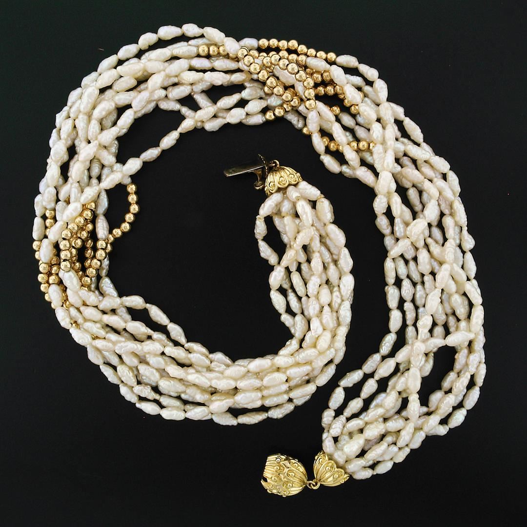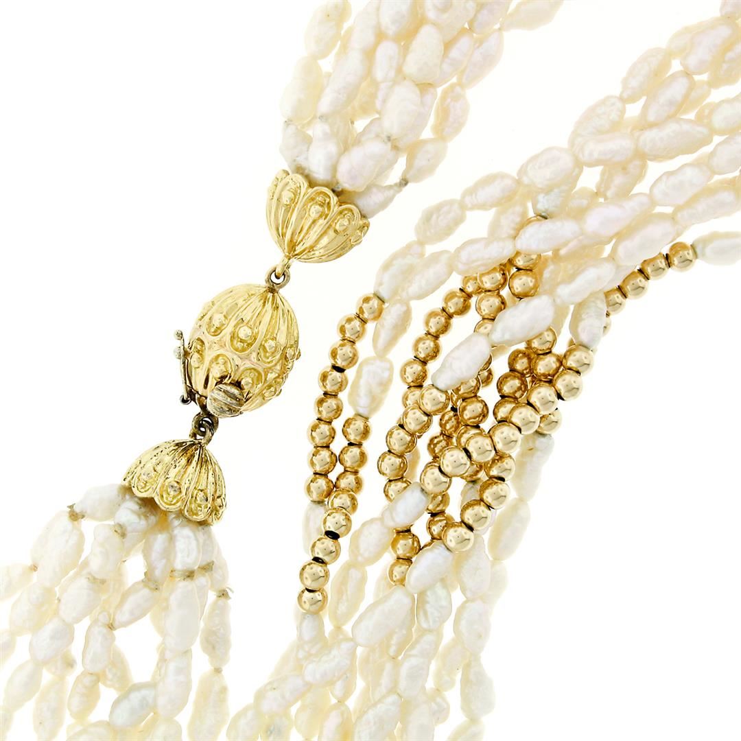 A vintage multi-strand necklace with approximately 510 cultured freshwater pearls (10.0x4.0mm), a solid 18k yellow gold clasp, and numerous solid 14k yellow gold beads. Weighs a total of 130.69 grams, measures 20.6mm wide, and measures 20 inches in length.