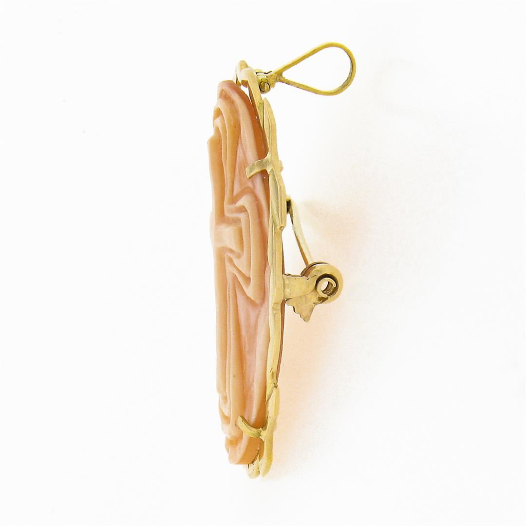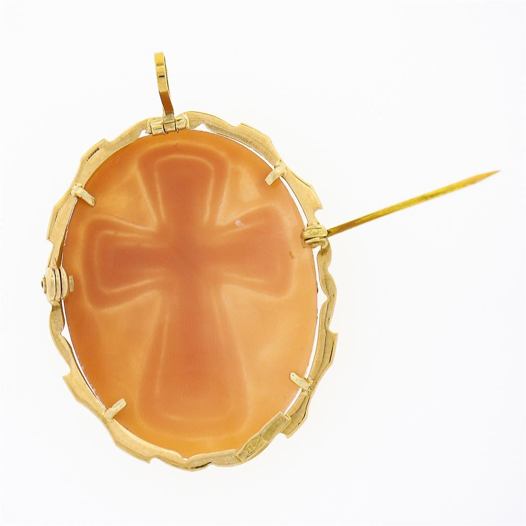 A solid 18k yellow gold pin brooch pendant, with 1 oval shape carved cameo shell (30.5x23.2mm). Measures 39.20x26.60mm and weighs a total of 3.77 grams.