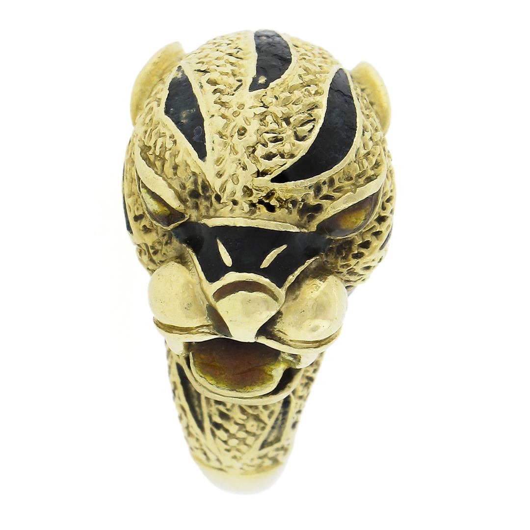 A vintage solid 18k yellow gold with black & orange enamel work leopard ring. The ring is size 3.5, weighs a total of 13 grams, and measures 13.7mm wide.