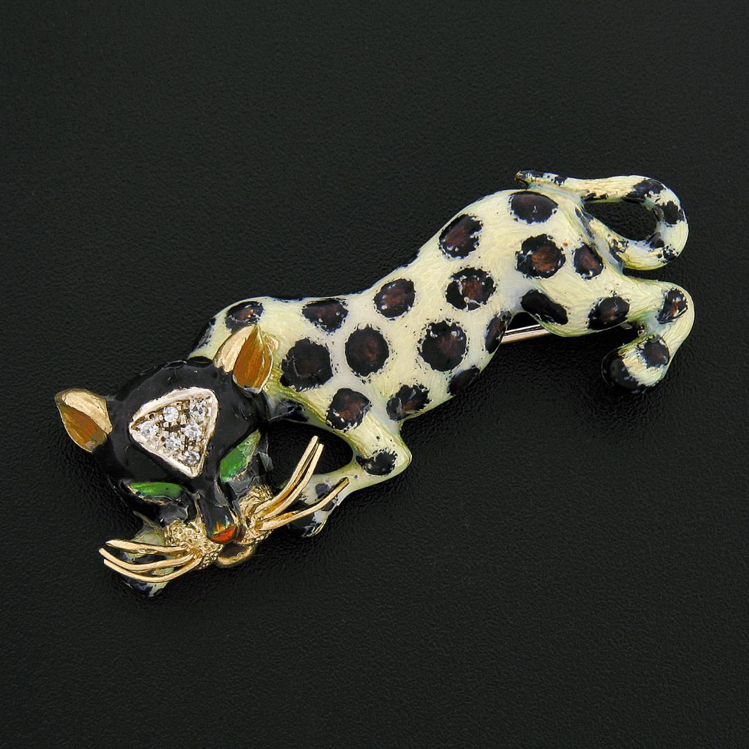 A vintage solid 18k yellow & white gold and enamel whorl leopard brooch, with 6 old single cut natural diamonds (G/H - VS2/SI1 ; 0.12ctw). Measures 20.9x54.2mm and weighs a total of 18.09 grams.
