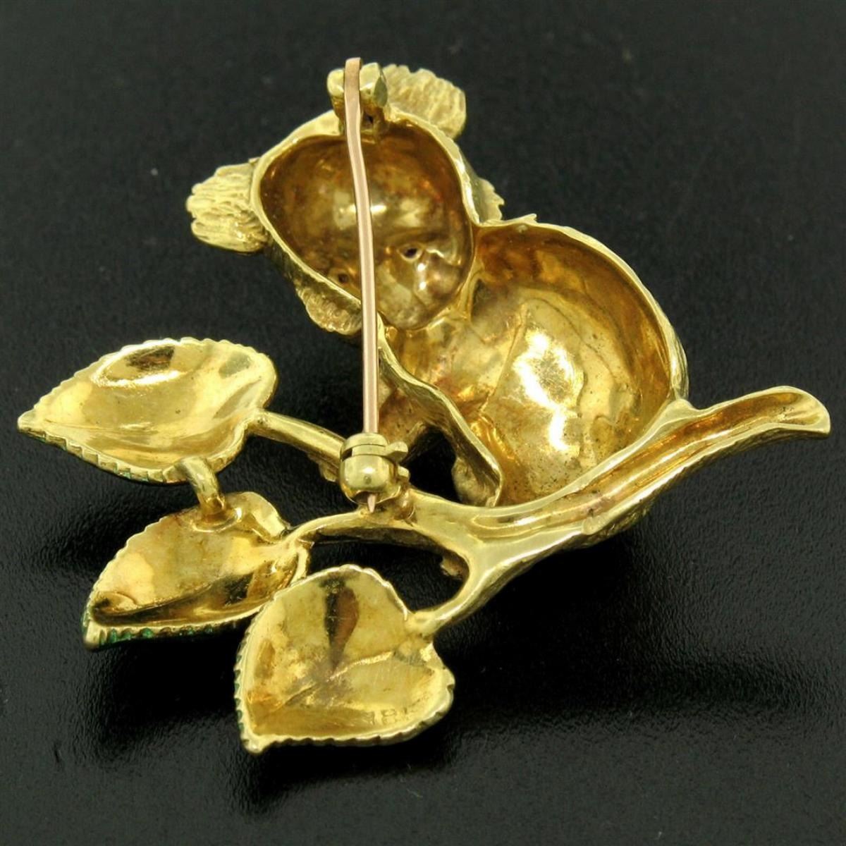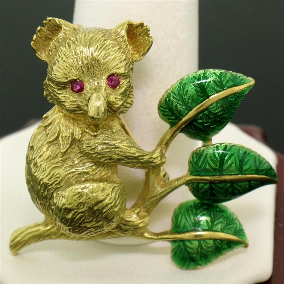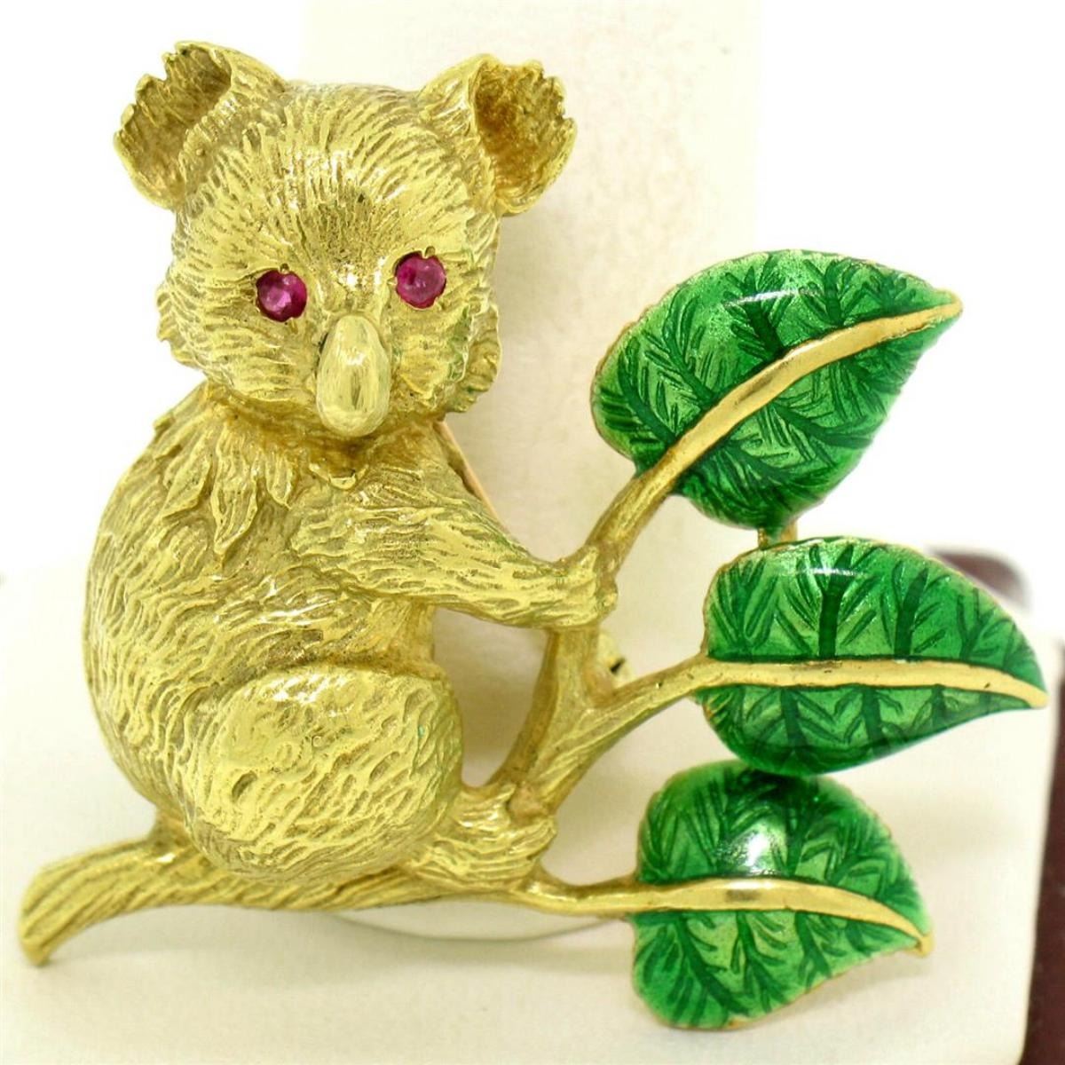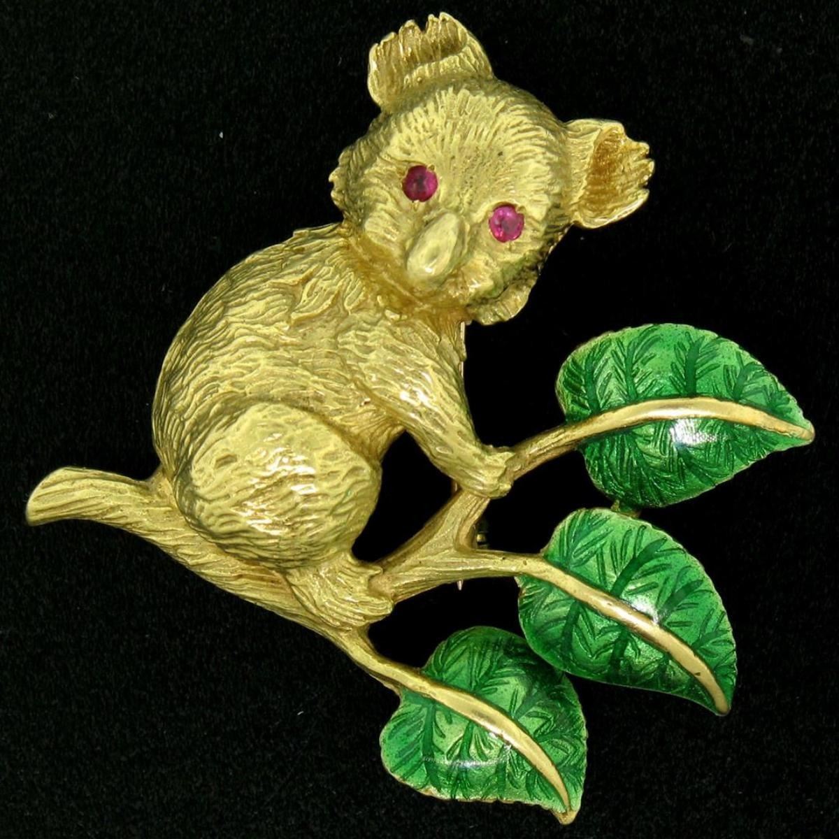 One Vintage 18k Gold Detailed Koala Brooch Pin w/ Ruby Eyes & Green Enamel Leaves. Item Details: Material: 18k Solid Yellow Gold, Total Weight: 15.3 Grams, Stone(s): (2) Natural Genuine Rubies - Round Cut - Bead Set - Blood Red Color - 0.08ctw (approx.), Overall Height: 34.0mm, Overall Width: 34.1mm, Overall Thickness: 10.4mm, Clasp: Pin w/ Rotating Closure Mechanism, Condition: Vintage piece. Amazing, like new, all original condition!