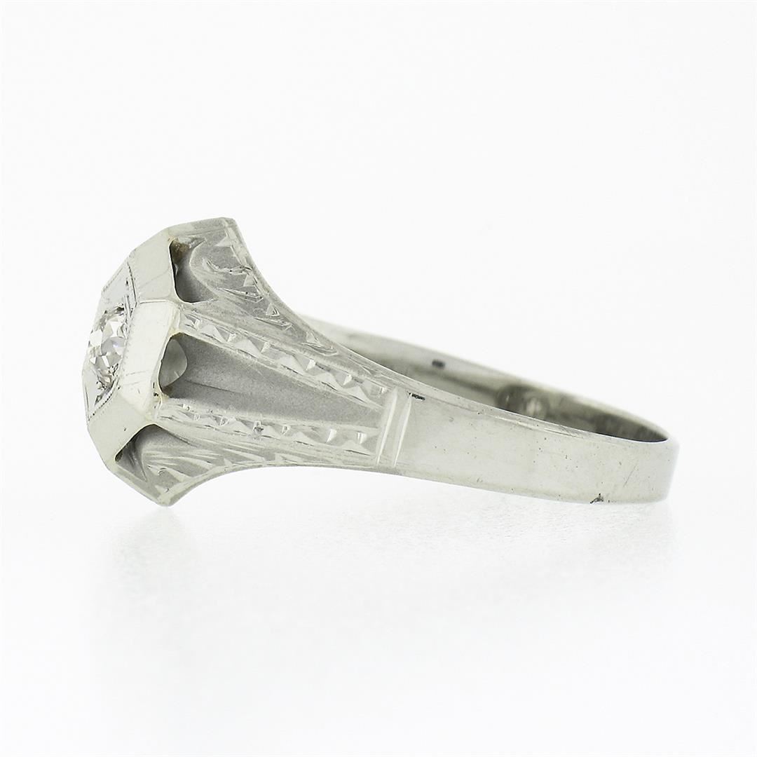 A solid 18k white gold ring, with 1 old mine cut natural diamond (I - VS2 ; 0.18ct). The ring is size 9.0, weighs a total of 4.42 grams, and measures 11.85mm wide.