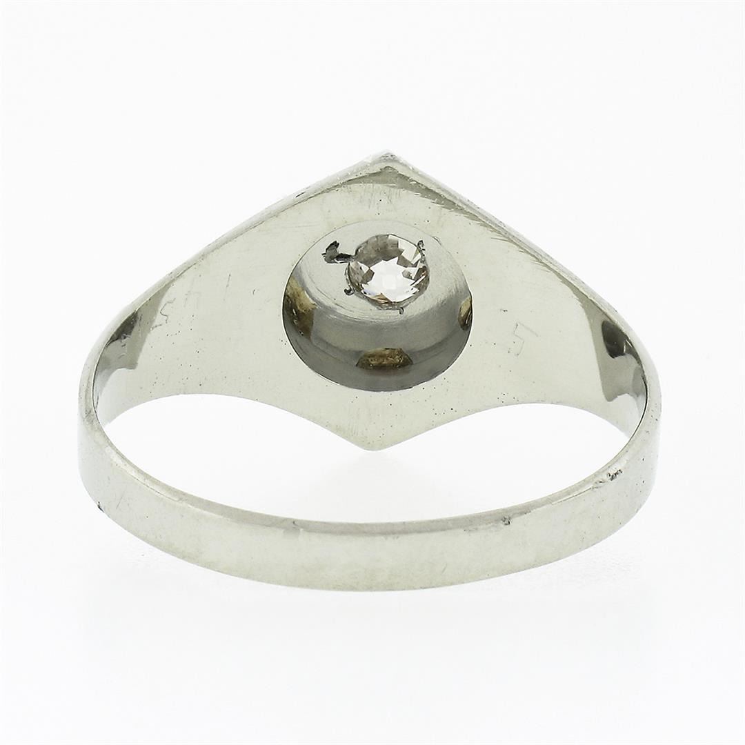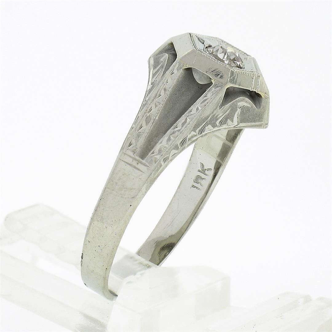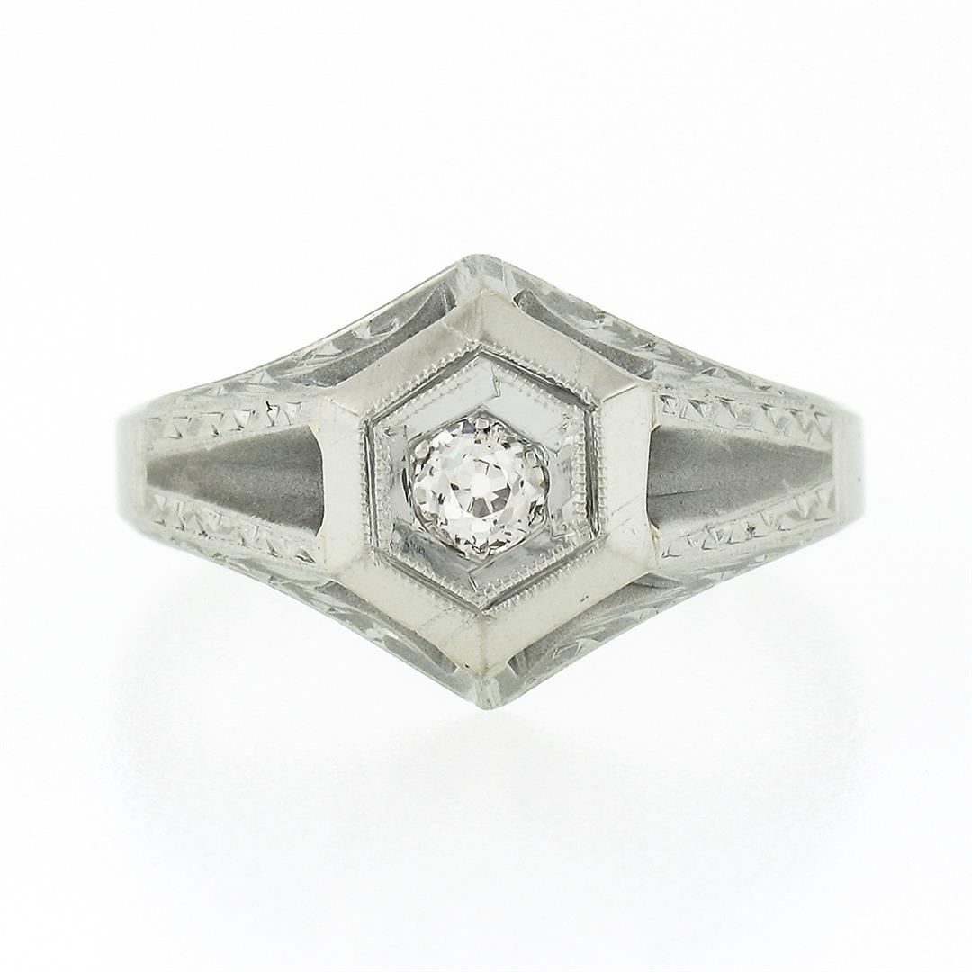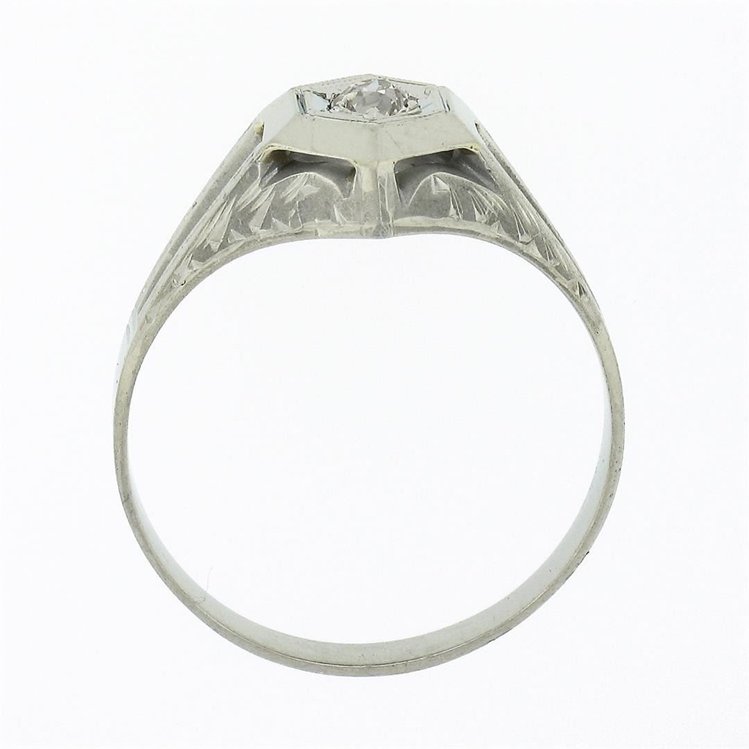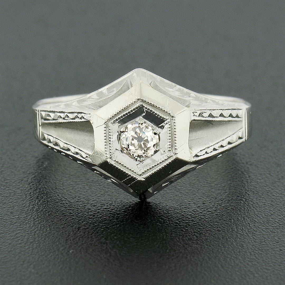 A solid 18k white gold ring, with 1 old mine cut natural diamond (I - VS2 ; 0.18ct). The ring is size 9.0, weighs a total of 4.42 grams, and measures 11.85mm wide.