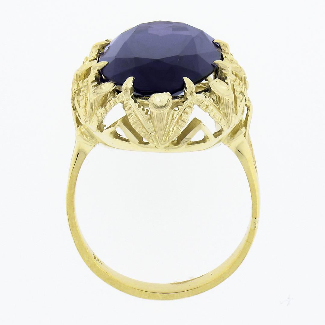 A vintage solid 18k yellow gold textured solitaire ring, with 1 oval cut synthetic alexandrite (20x12.1mm). The ring is size 8.0, weighs a total of 9.78 grams, and measures 24.70mm wide.