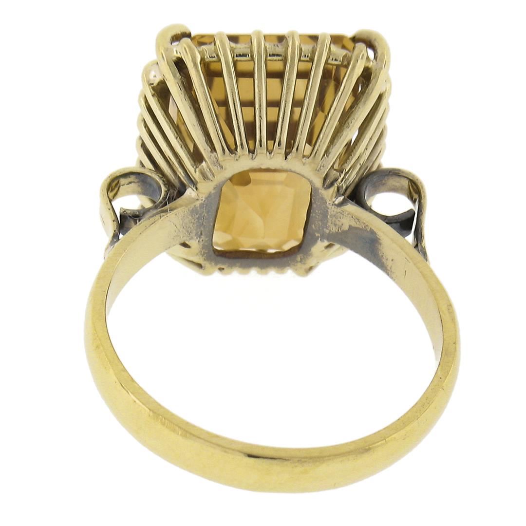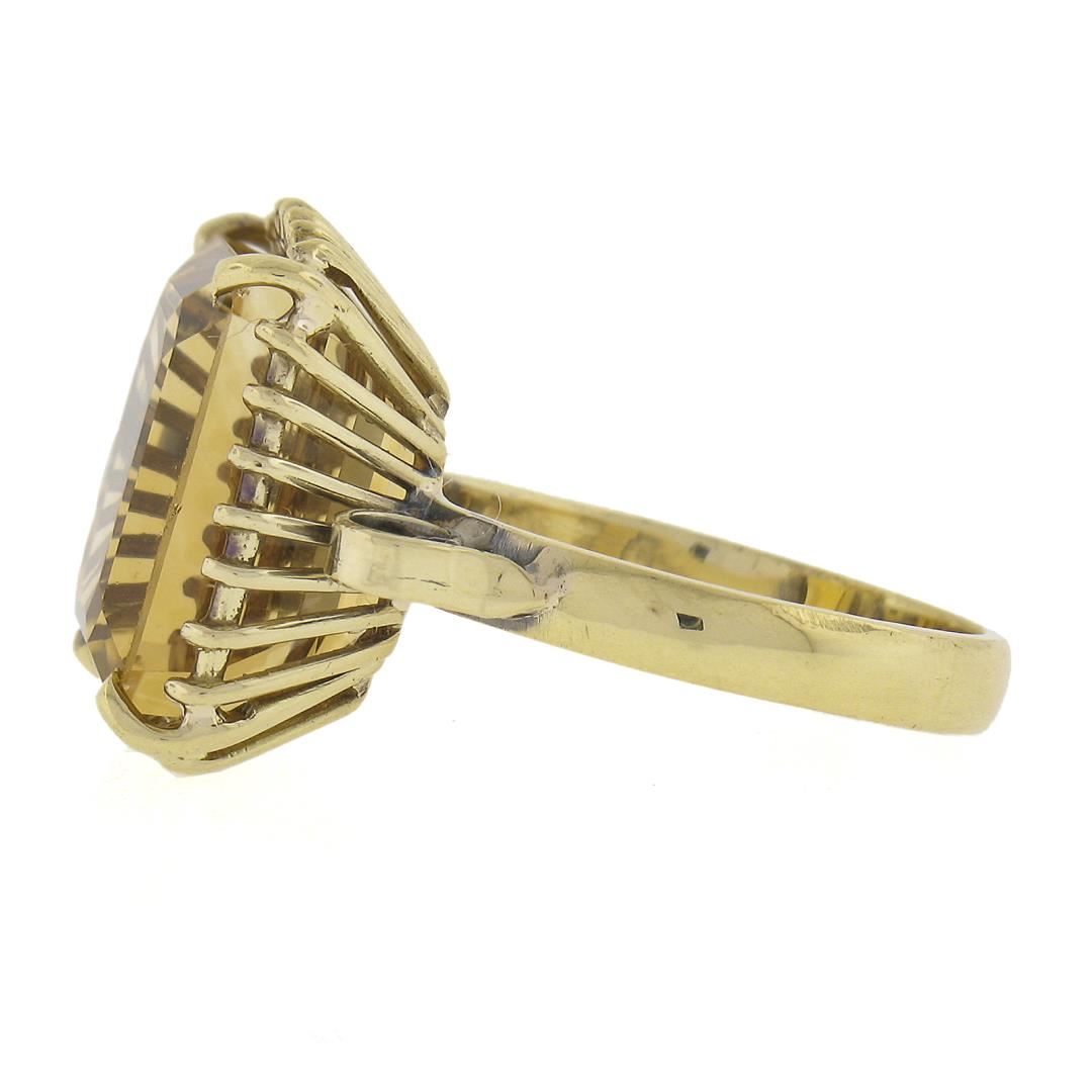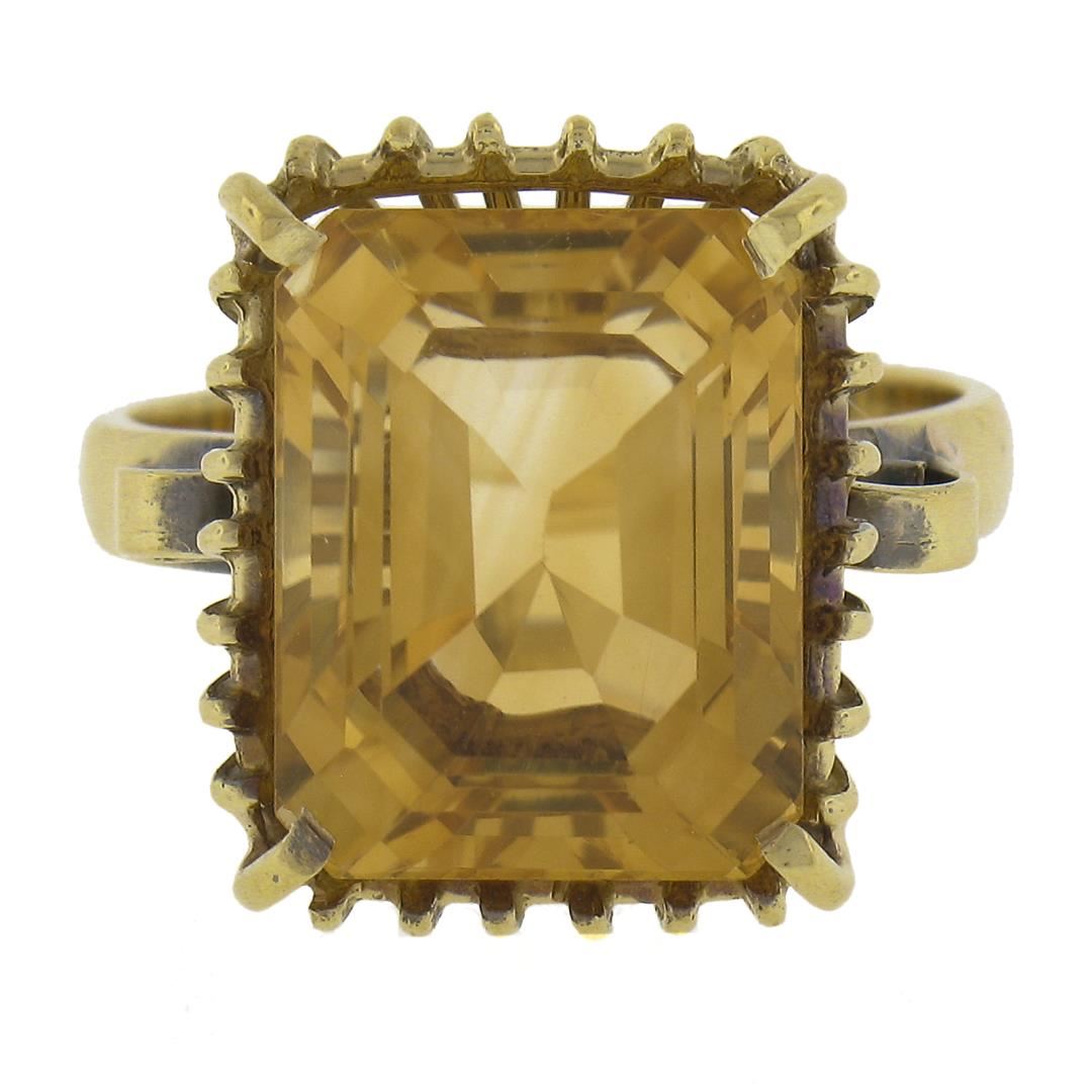 A vintage solid 18k yellow gold solitaire cocktail ring, with 1 emerald cut natural citrine (13x10.2mm). The ring is size 6.0, weighs a total of 6.44 grams, and measures 16.1mm wide.
