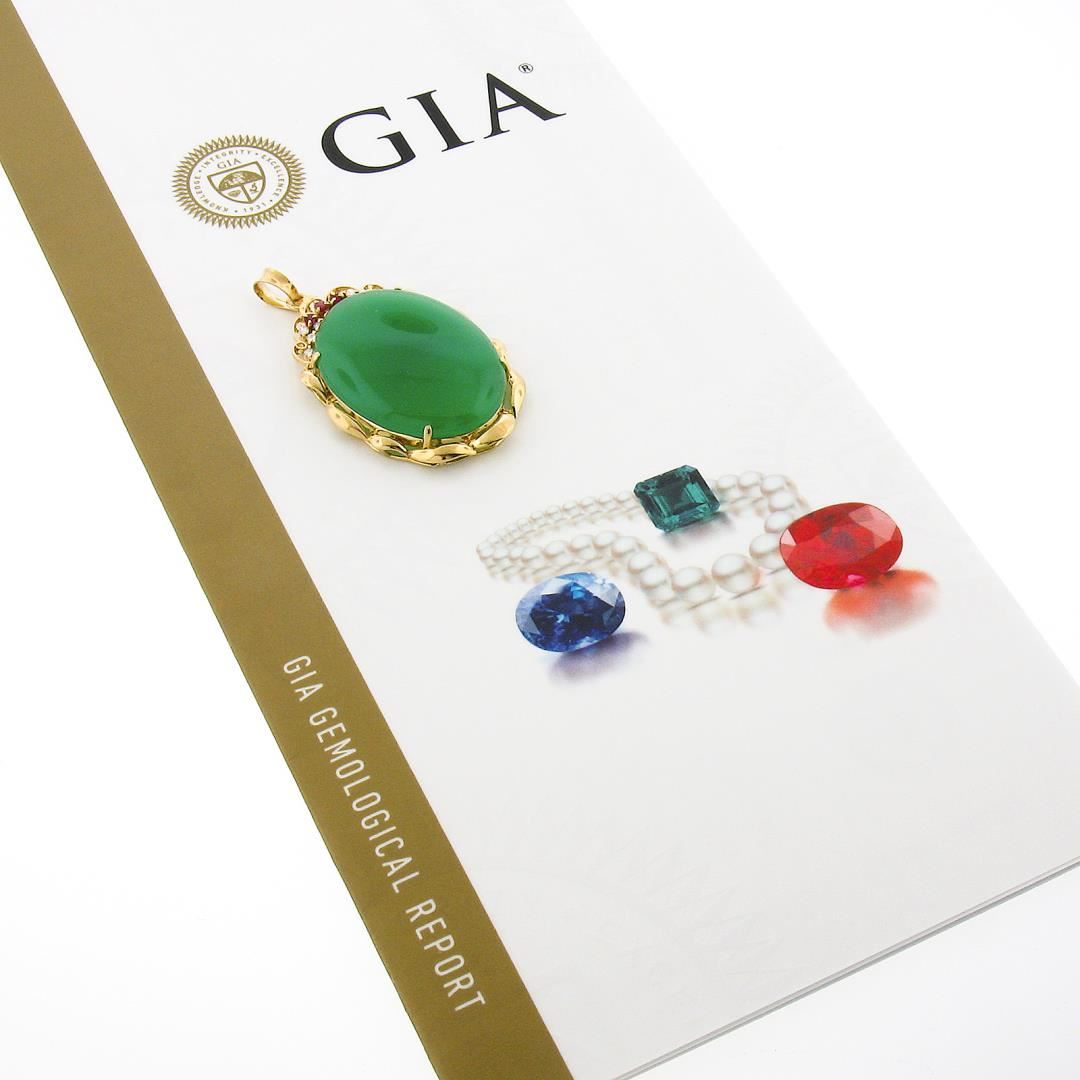 A vintage solid 18k yellow gold pendant, with 1 GIA graded oval cabochon cut natural chrysoprase (28.28x21.86x5.40mm), and 9 round brilliant cut natural diamonds (F/G - SI1/SI2 ; 0.12ctw). with 3 round brilliant cut natural rubies (0.05ctw). The pendant weighs a total of 8.05 grams, measures 44.7x26.1mm including the bail. Comes with all original relevant certifications.