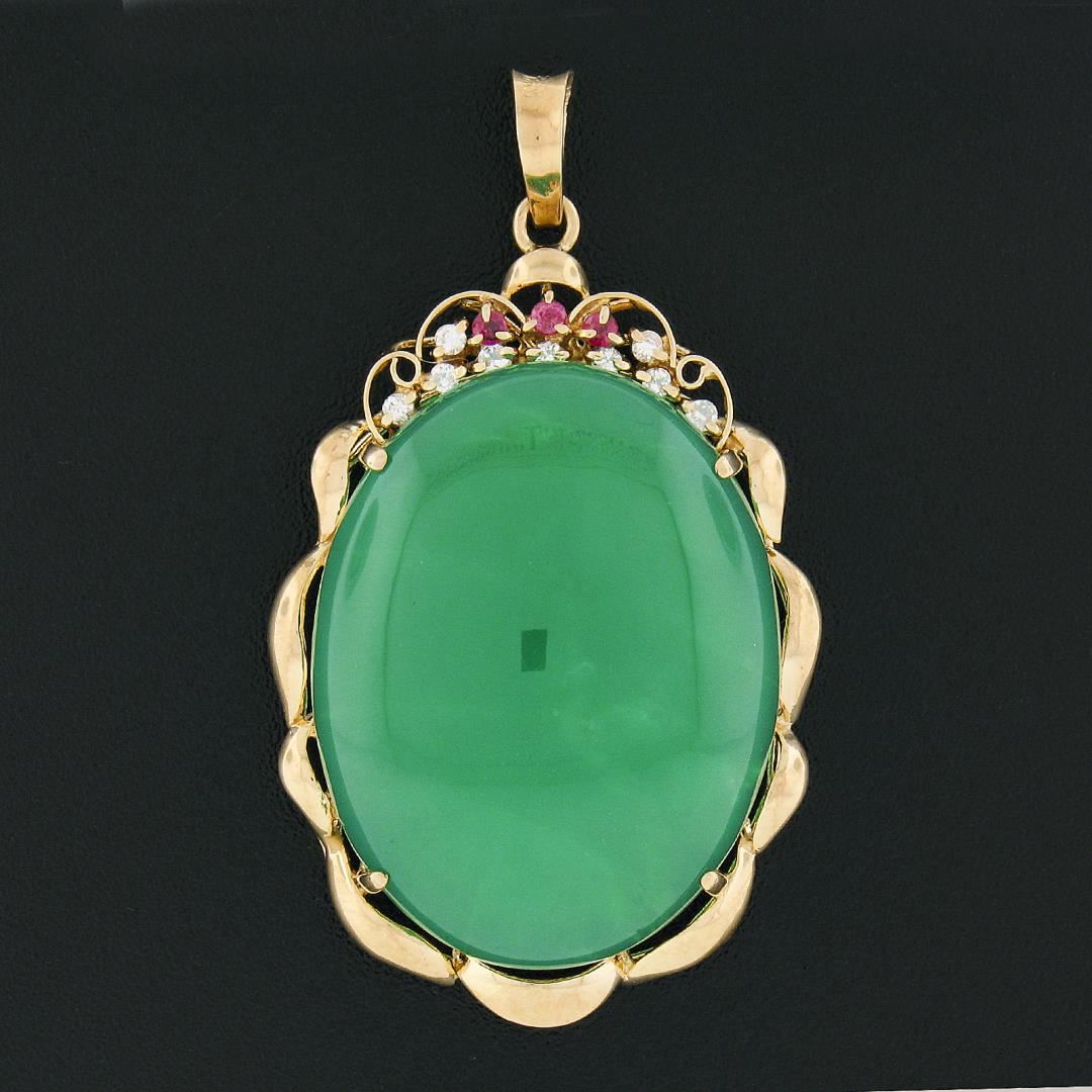 A vintage solid 18k yellow gold pendant, with 1 GIA graded oval cabochon cut natural chrysoprase (28.28x21.86x5.40mm), and 9 round brilliant cut natural diamonds (F/G - SI1/SI2 ; 0.12ctw). with 3 round brilliant cut natural rubies (0.05ctw). The pendant weighs a total of 8.05 grams, measures 44.7x26.1mm including the bail. Comes with all original relevant certifications.