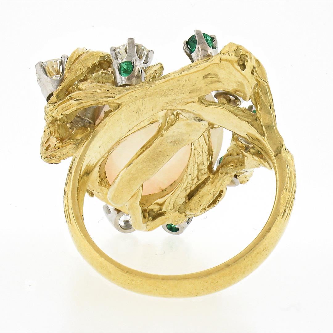 A vintage 18k yellow gold cocktail ring, with 1 GIA graded pear cabochon cut natural opal ( 20.03x11.4mm ), and 5 round brilliant cut natural diamonds (E/F - VS1 ; 0.60ctw), with 5 round brilliant cut natural emeralds (0.22ctw). The ring is size 6.0, weighs a total of 12.76 grams, and measures 34.30mm wide.Comes with all original relevant certifications.