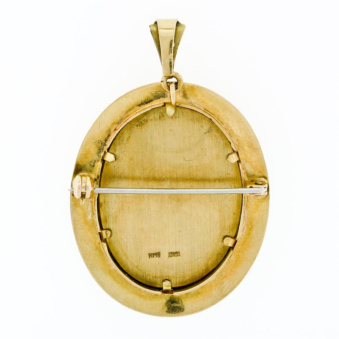 A vintage solid 18k yellow gold pendant with a hand painted portrait accented with 3 round single cut natural diamonds (F - VS1; 0.03ctw), all surrounded by a twisted rope and florentine finished frame. The pendant weighs a total of 12.44 grams, measures 49.1x31.8mm including the bail, and the inside of the bail Measures 6.9x3.15mm.
