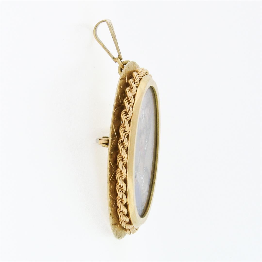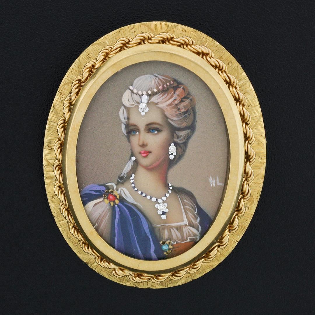 A vintage solid 18k yellow gold pendant with a hand painted portrait accented with 3 round single cut natural diamonds (F - VS1; 0.03ctw), all surrounded by a twisted rope and florentine finished frame. The pendant weighs a total of 12.44 grams, measures 49.1x31.8mm including the bail, and the inside of the bail Measures 6.9x3.15mm.