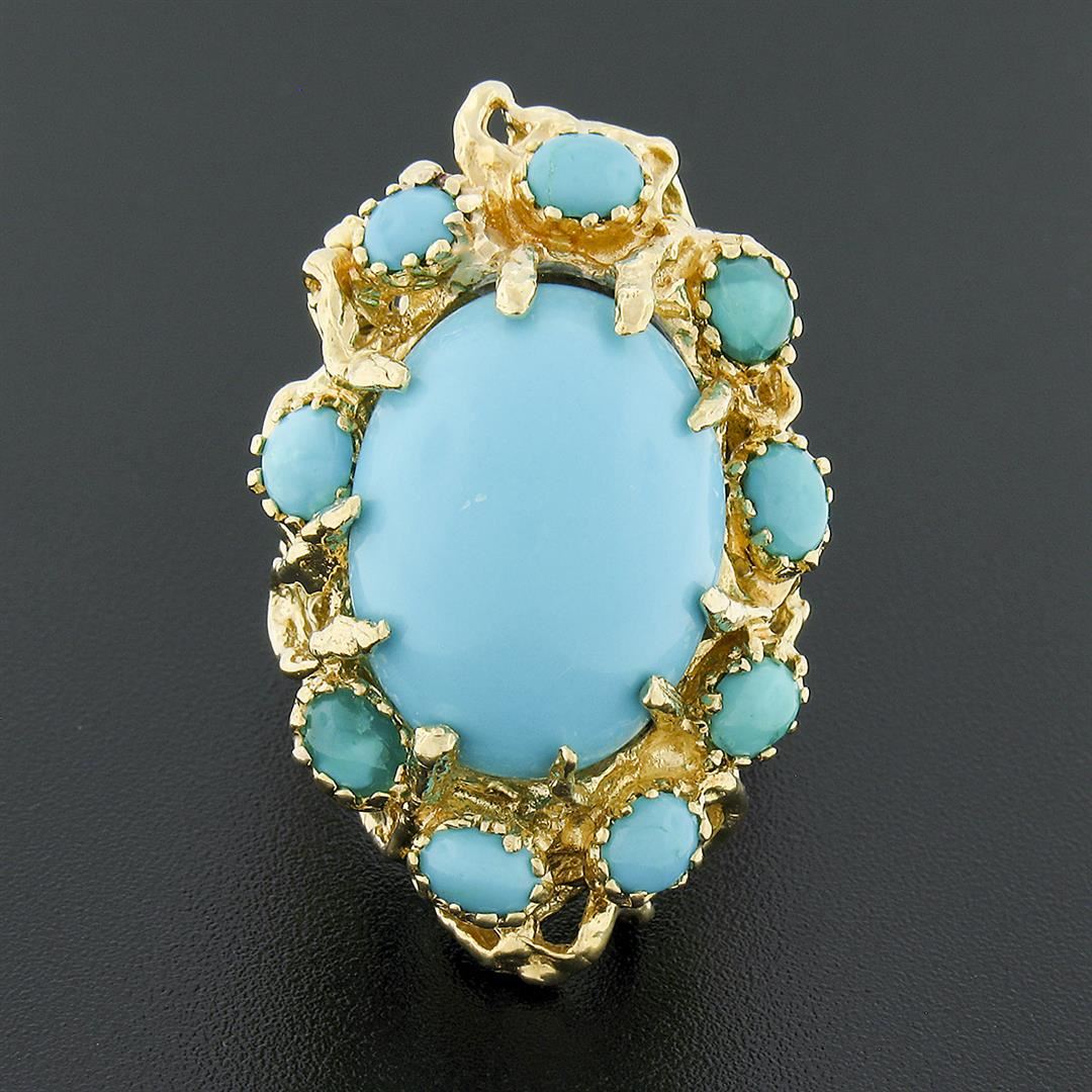 A vintage solid 18k yellow gold ring, with 1 oval cabochon cut natural turquoise (20.0x15.10mm), surrounded with 9 oval cabochon cut natural turquoises (4.60x3.20mm each). The ring is size 8.0, weighs a total of 23.90 grams, and measures 37.40mm wide.