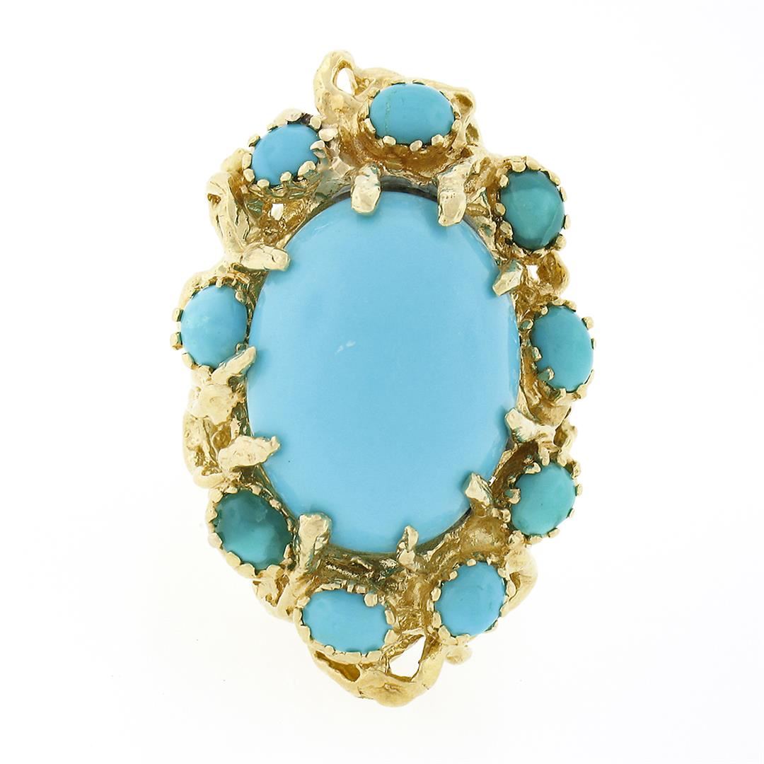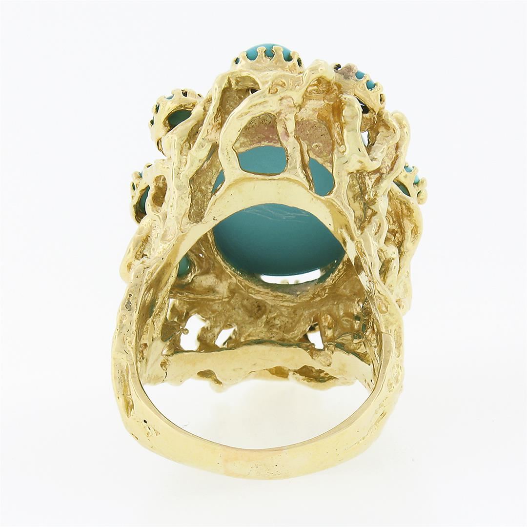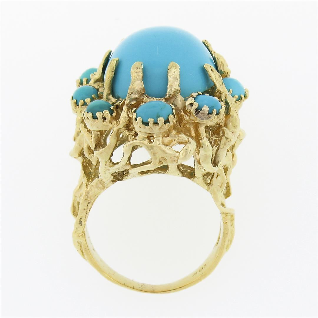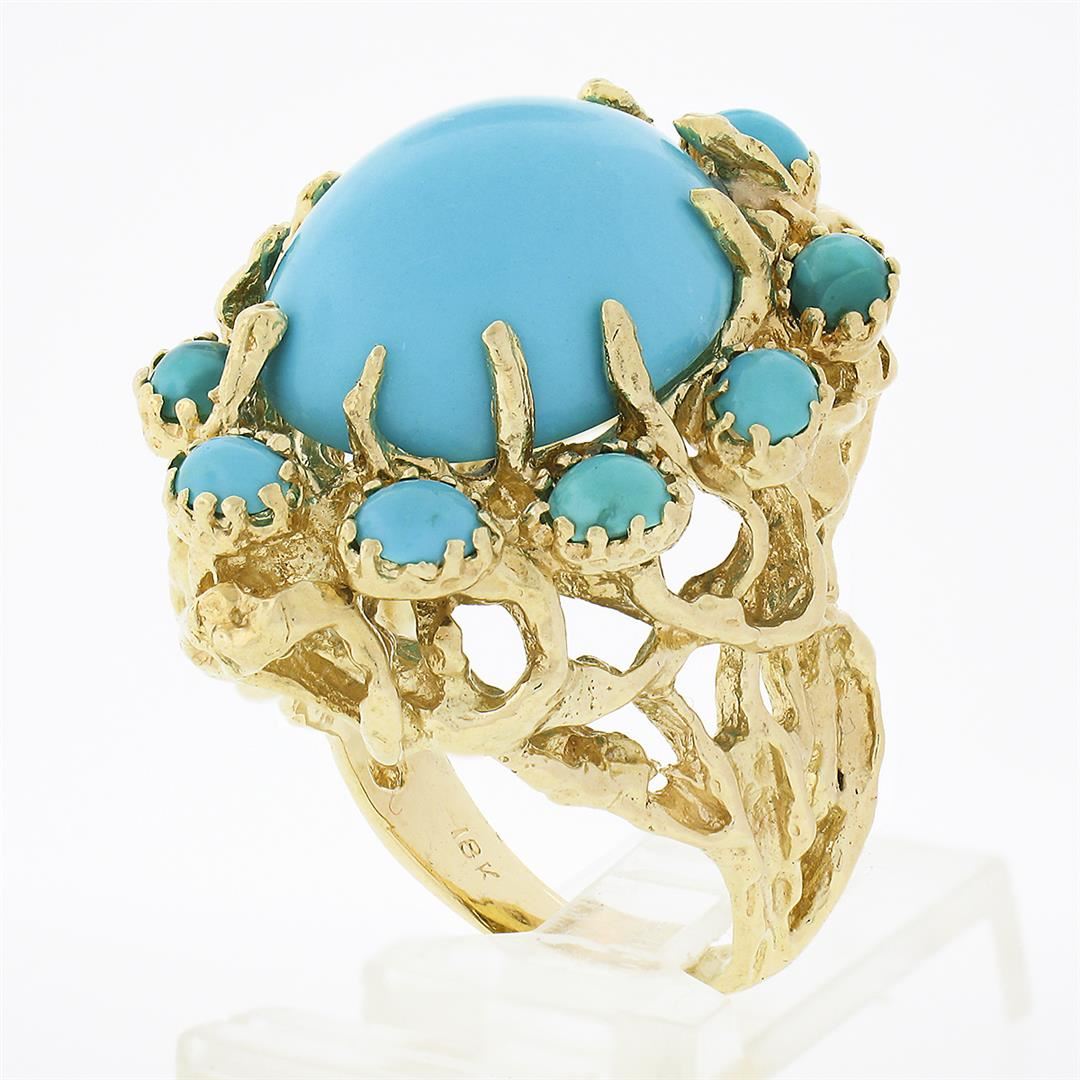 A vintage solid 18k yellow gold ring, with 1 oval cabochon cut natural turquoise (20.0x15.10mm), surrounded with 9 oval cabochon cut natural turquoises (4.60x3.20mm each). The ring is size 8.0, weighs a total of 23.90 grams, and measures 37.40mm wide.