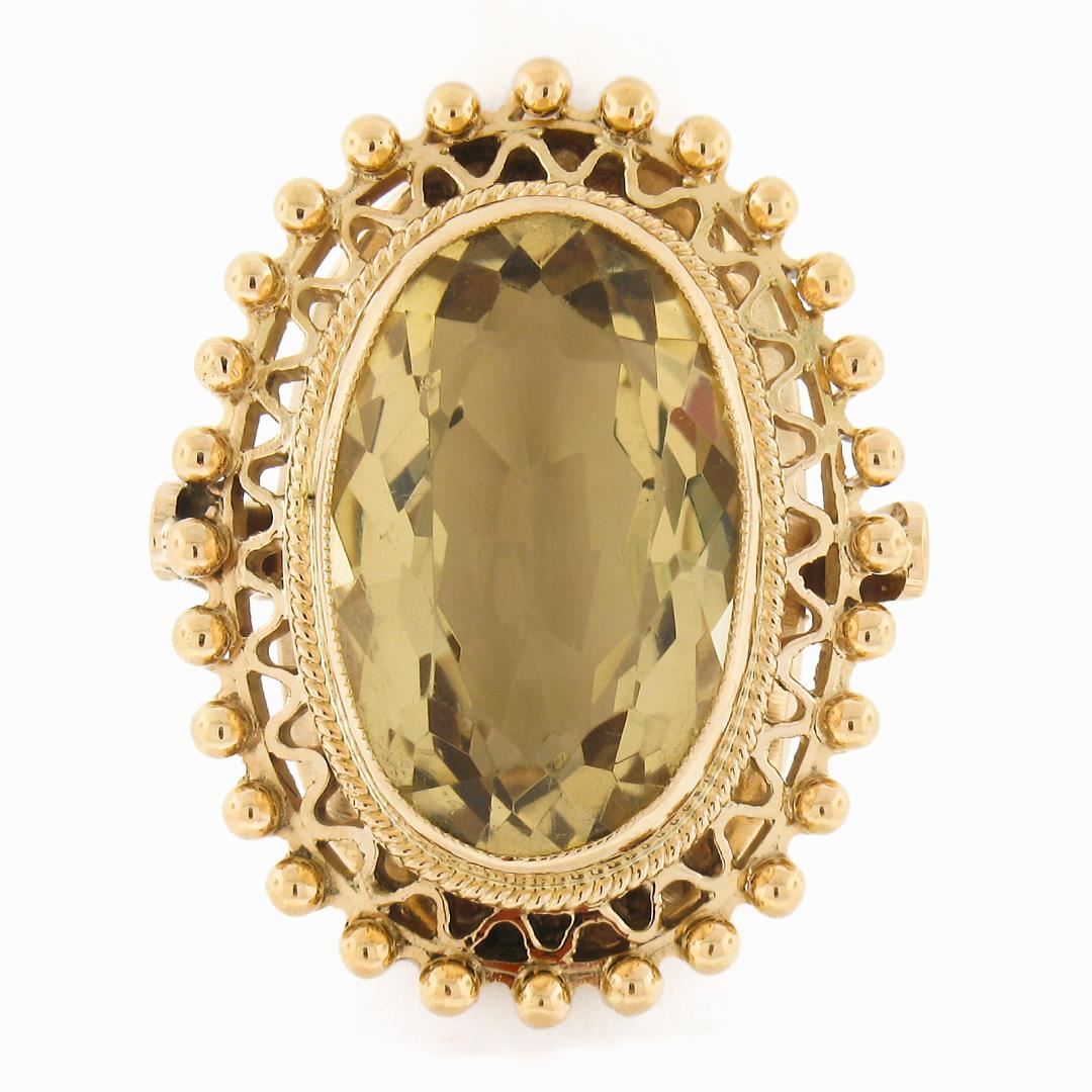 A vintage solid 18k yellow gold ring, with 1 oval cut natural citrine (18x12mm - 8.5 carat). The ring is size 4.0, weighs a total of 11.33 grams, and measures 27.5mm wide.