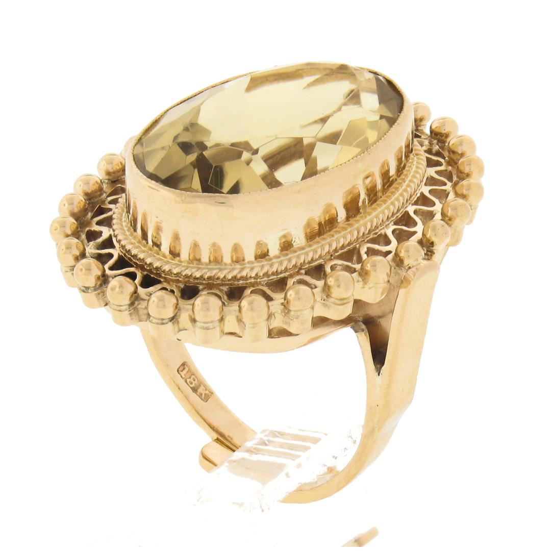 A vintage solid 18k yellow gold ring, with 1 oval cut natural citrine (18x12mm - 8.5 carat). The ring is size 4.0, weighs a total of 11.33 grams, and measures 27.5mm wide.