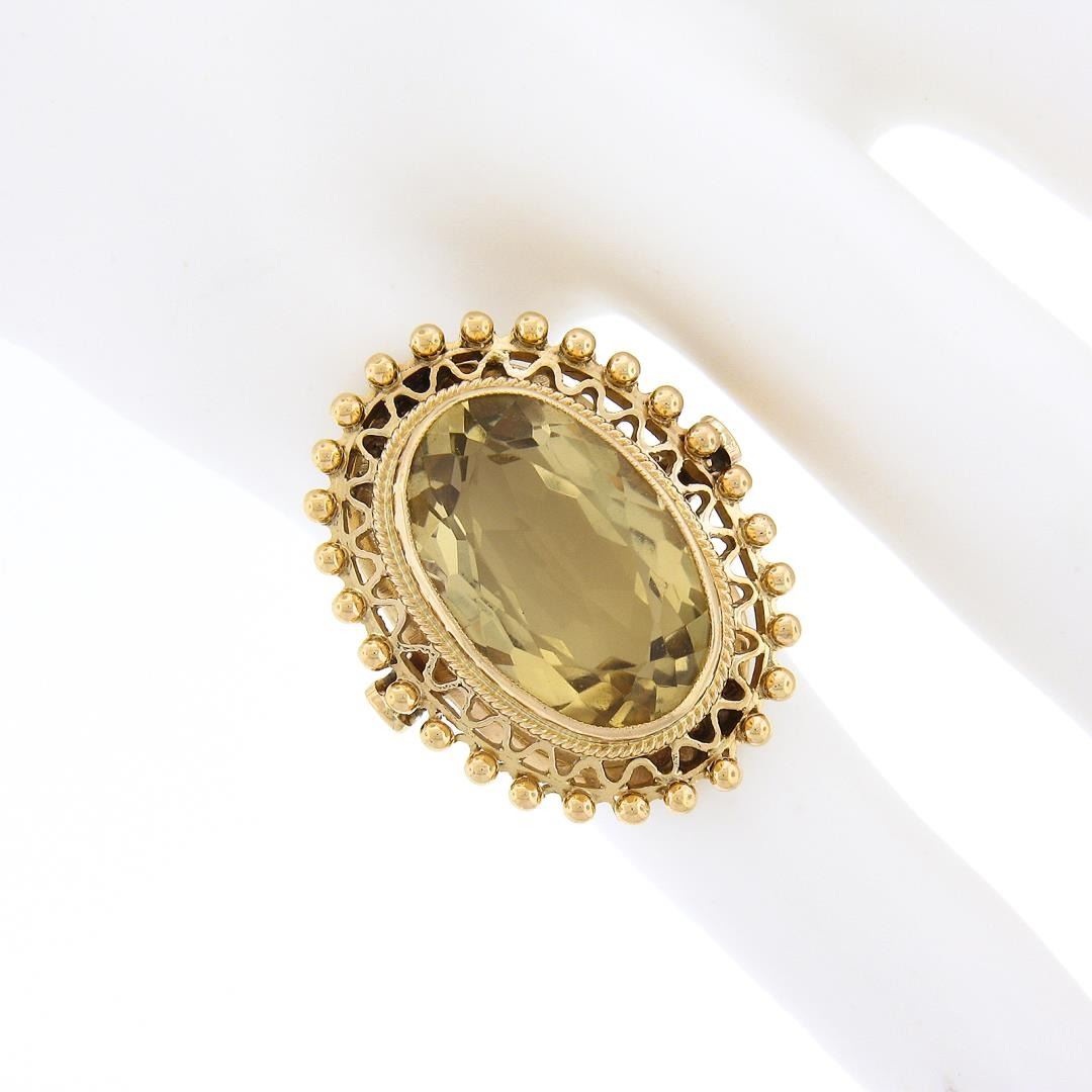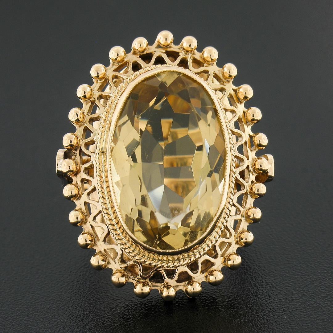 A vintage solid 18k yellow gold ring, with 1 oval cut natural citrine (18x12mm - 8.5 carat). The ring is size 4.0, weighs a total of 11.33 grams, and measures 27.5mm wide.