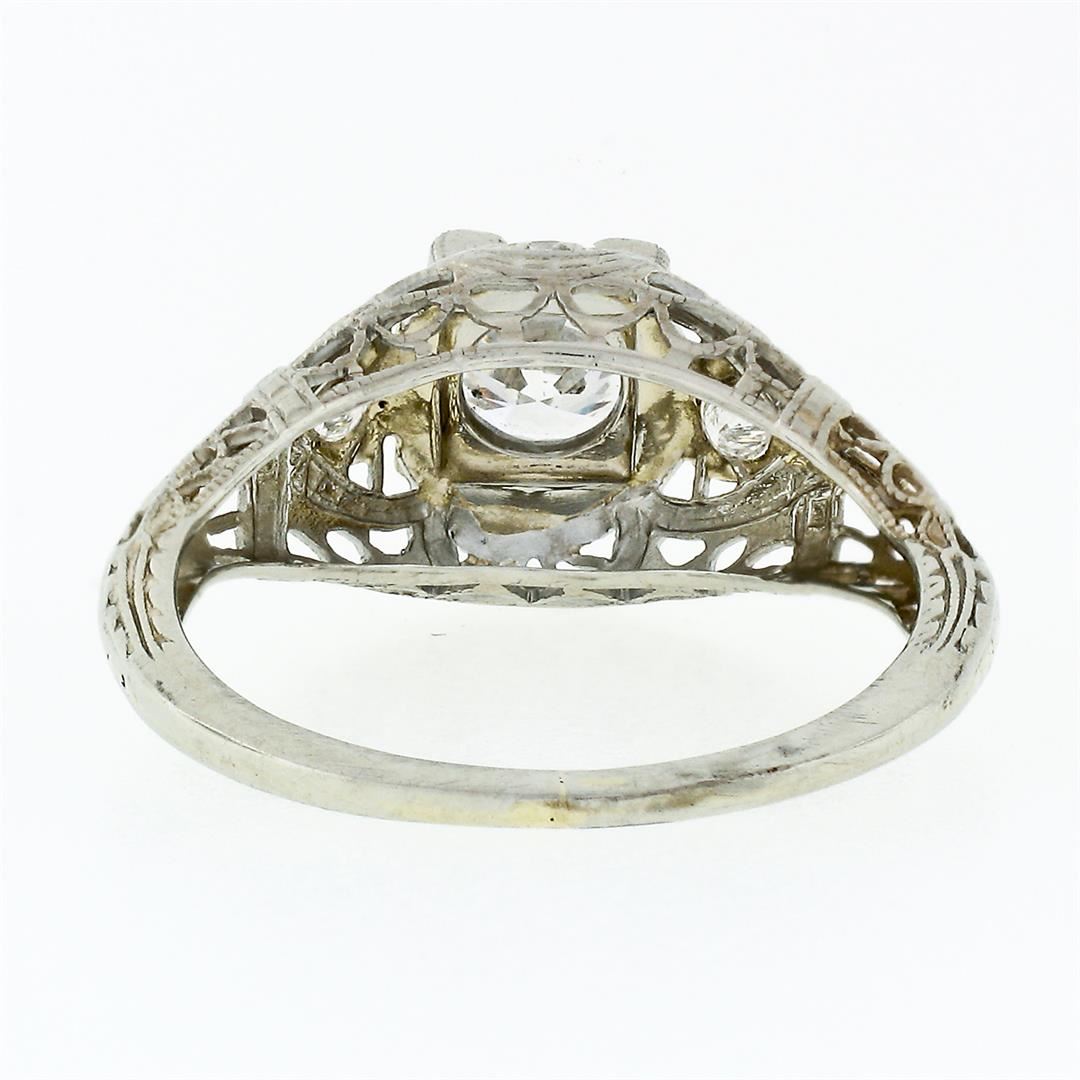 A vintage solide 18k white gold filigree engagement ring, with 1 old transitional cut natural diamond (H - SI2; 0.60ct), and 2 old single cut natural diamonds (G/H - SI1/SI2; 0.06ctw). The ring is size 5.5, weighs a total of 2.17 grams, and measures 9mm wide.