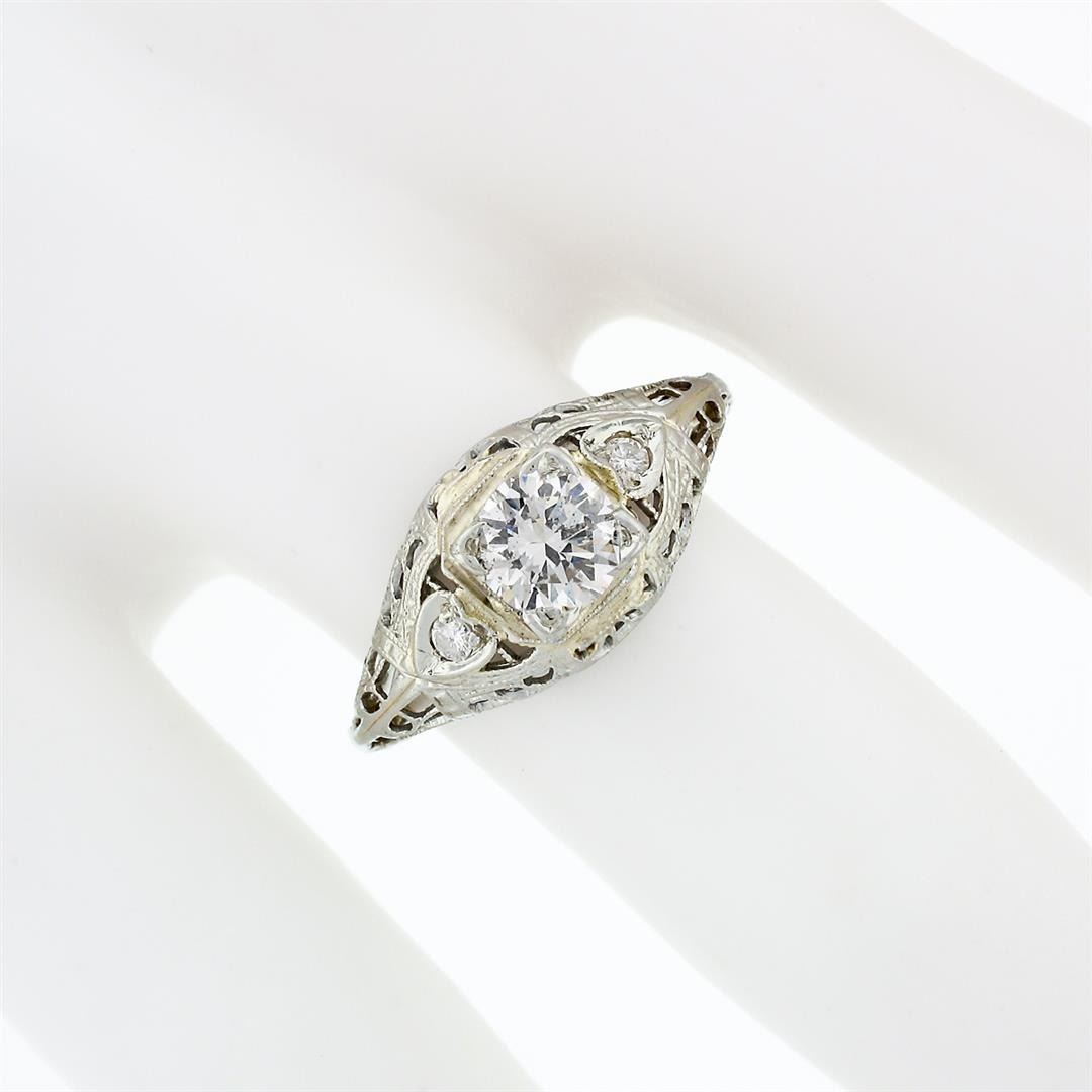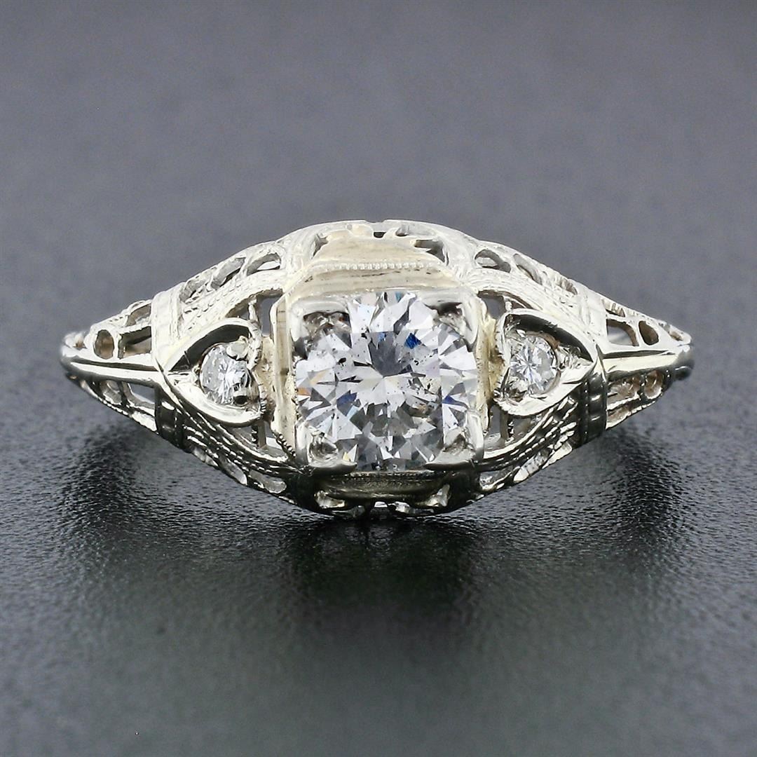 A vintage solide 18k white gold filigree engagement ring, with 1 old transitional cut natural diamond (H - SI2; 0.60ct), and 2 old single cut natural diamonds (G/H - SI1/SI2; 0.06ctw). The ring is size 5.5, weighs a total of 2.17 grams, and measures 9mm wide.