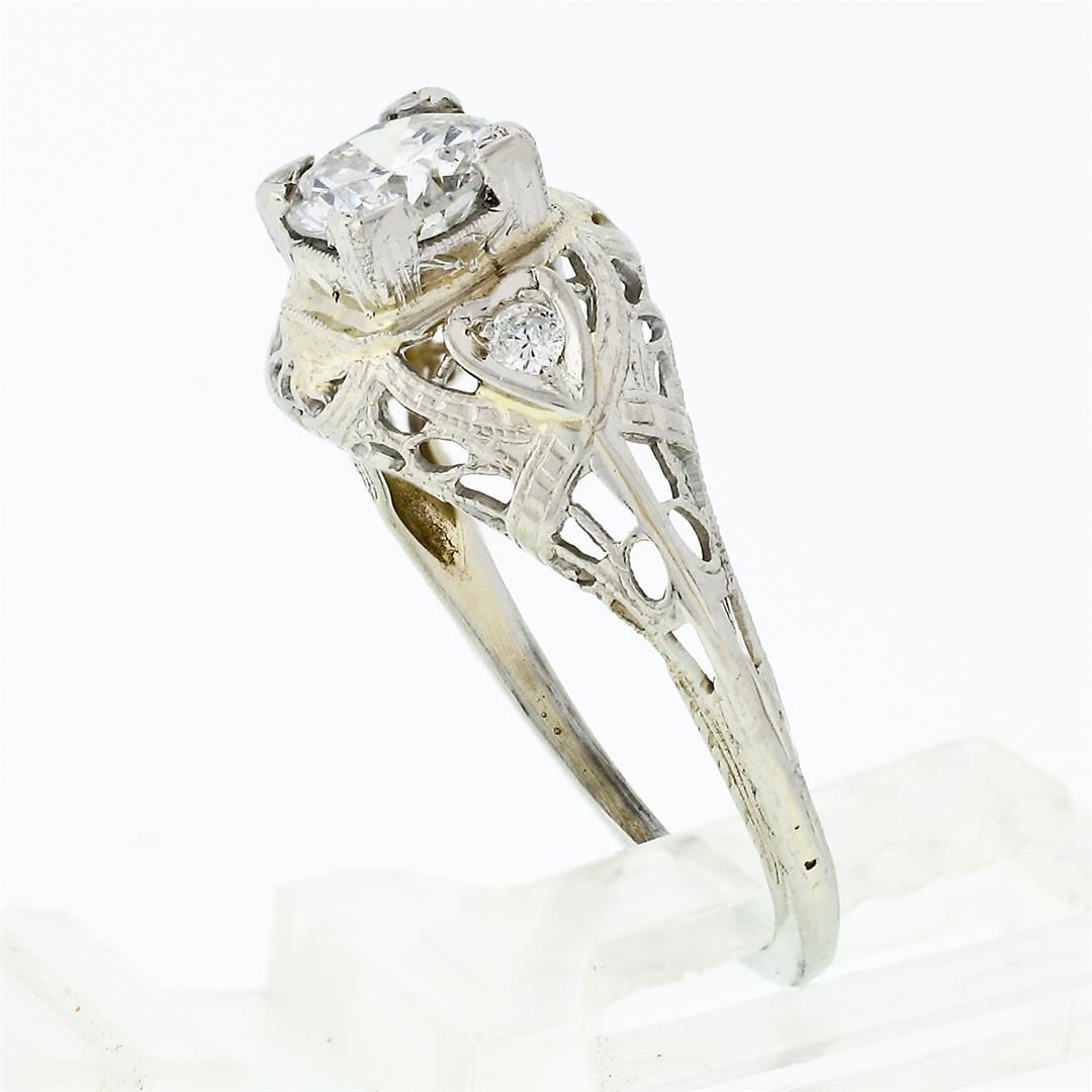 A vintage solide 18k white gold filigree engagement ring, with 1 old transitional cut natural diamond (H - SI2; 0.60ct), and 2 old single cut natural diamonds (G/H - SI1/SI2; 0.06ctw). The ring is size 5.5, weighs a total of 2.17 grams, and measures 9mm wide.