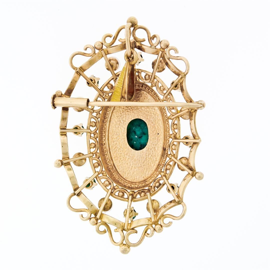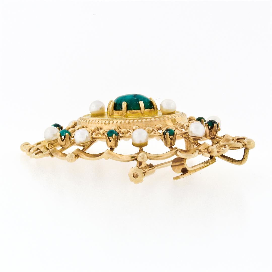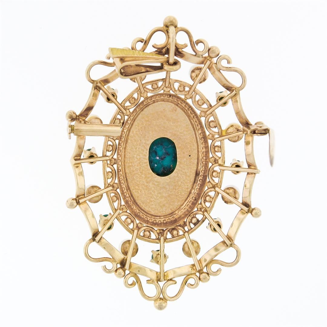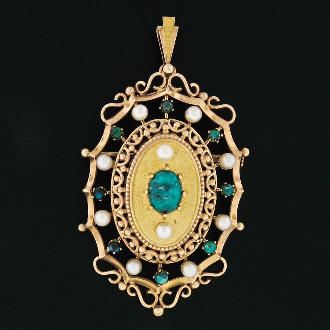 A vintage solid 18k yellow gold brooch pendant, featuring 1 round cabochon cut natural turquoise (8.9x7.2mm), surrounded with 8 round cabochon cut natural turquoise ( 2.35mm), and 10 round shape natural pearls (3.2 to 3.5mm ). Measures 62.59x35.03mm and weighs a total of 12.85 grams.