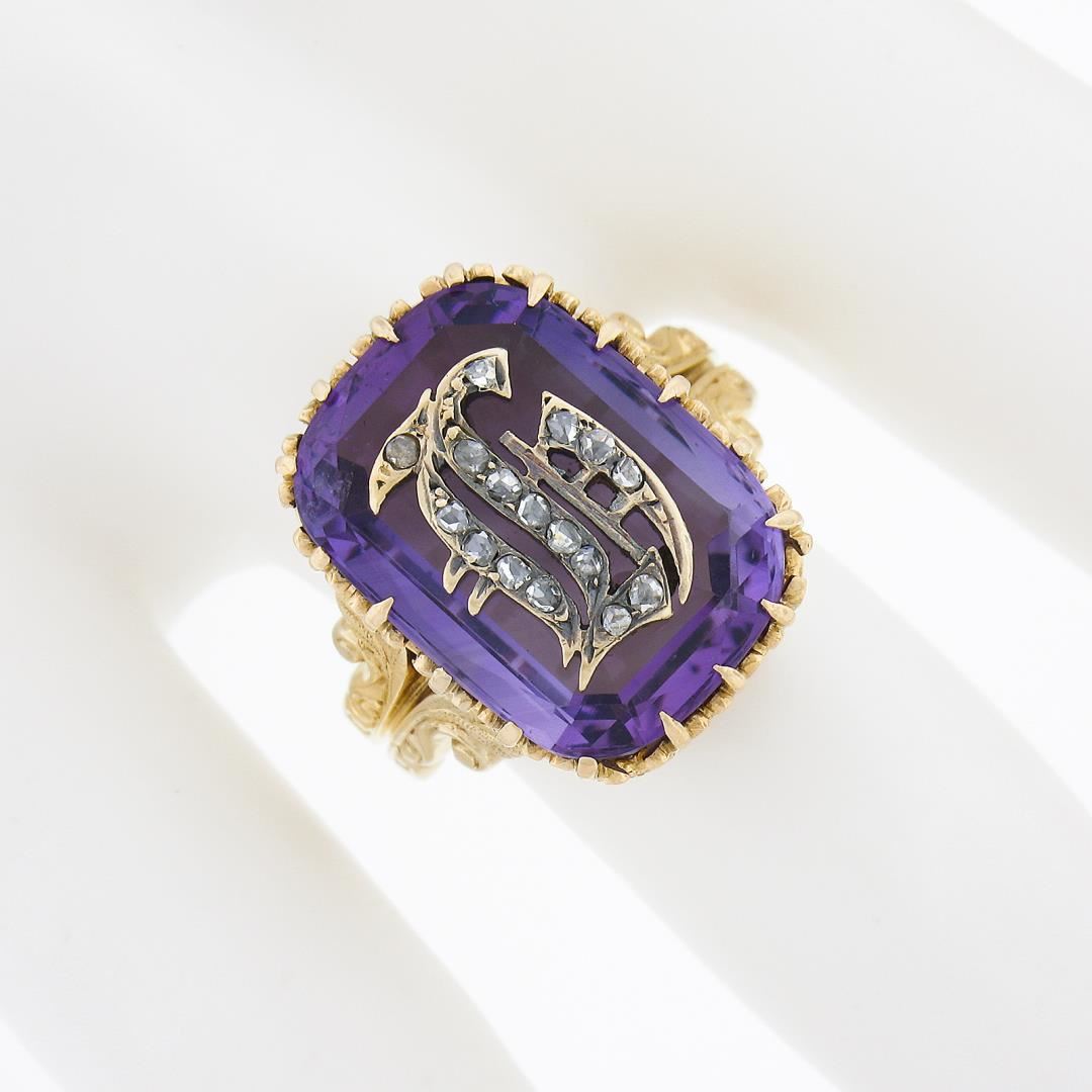 A vintage solid 18k yellow gold cocktail ring, with 1 elongated cushion cut natural amethyst (17.2x12.5mm), and 16 rose cut natural diamonds (H/I - SI1-I1 ; 0.30ctw). The ring is size 6.0, weighs a total of 9.53 grams, and measures 18.5mm wide.