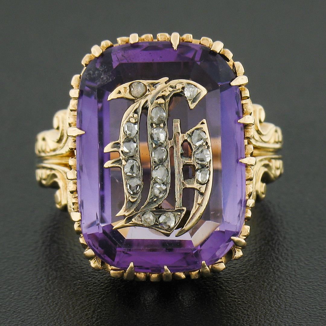 Vintage 18k Gold Repousse Amethyst & Diamond Old English Letter Cocktail Ring