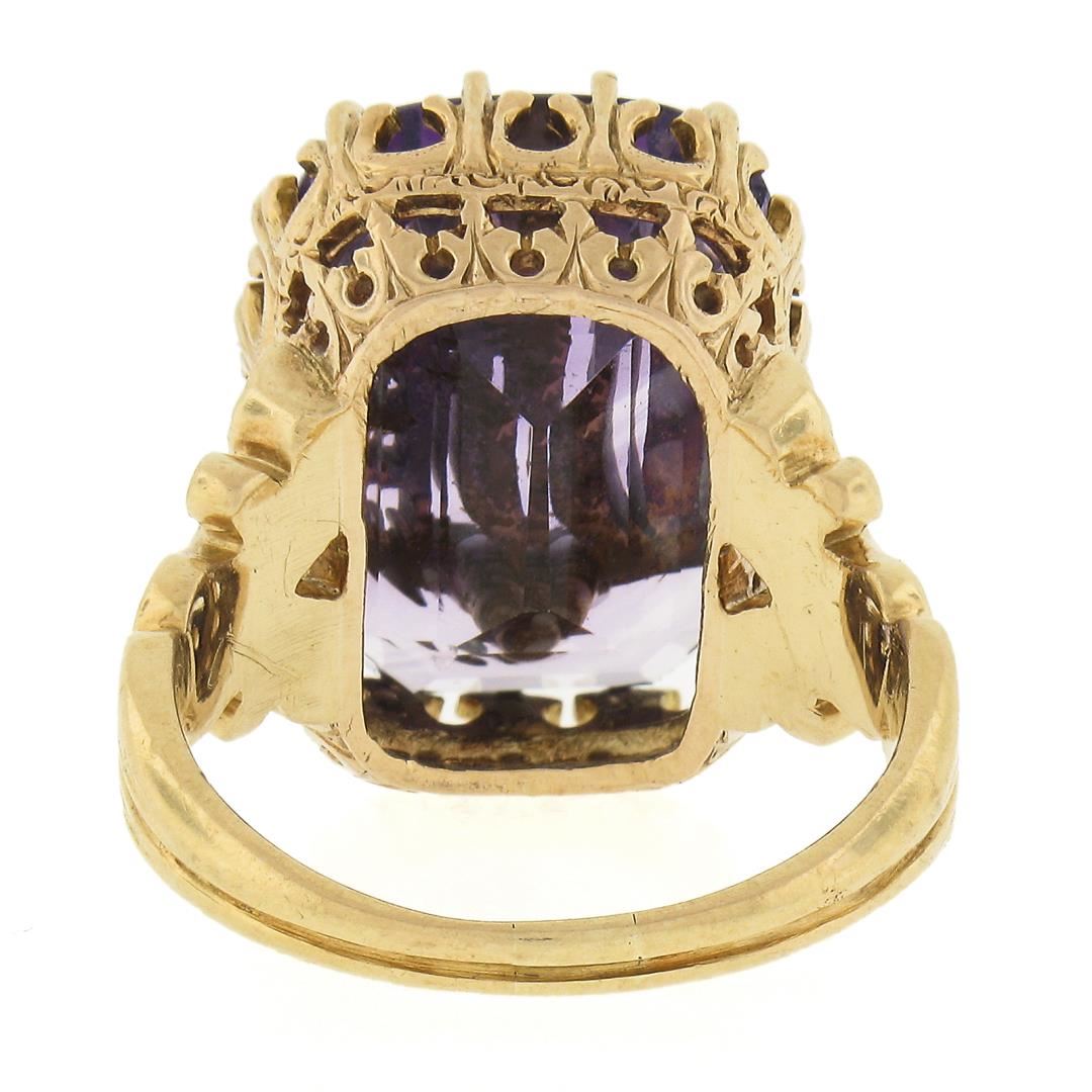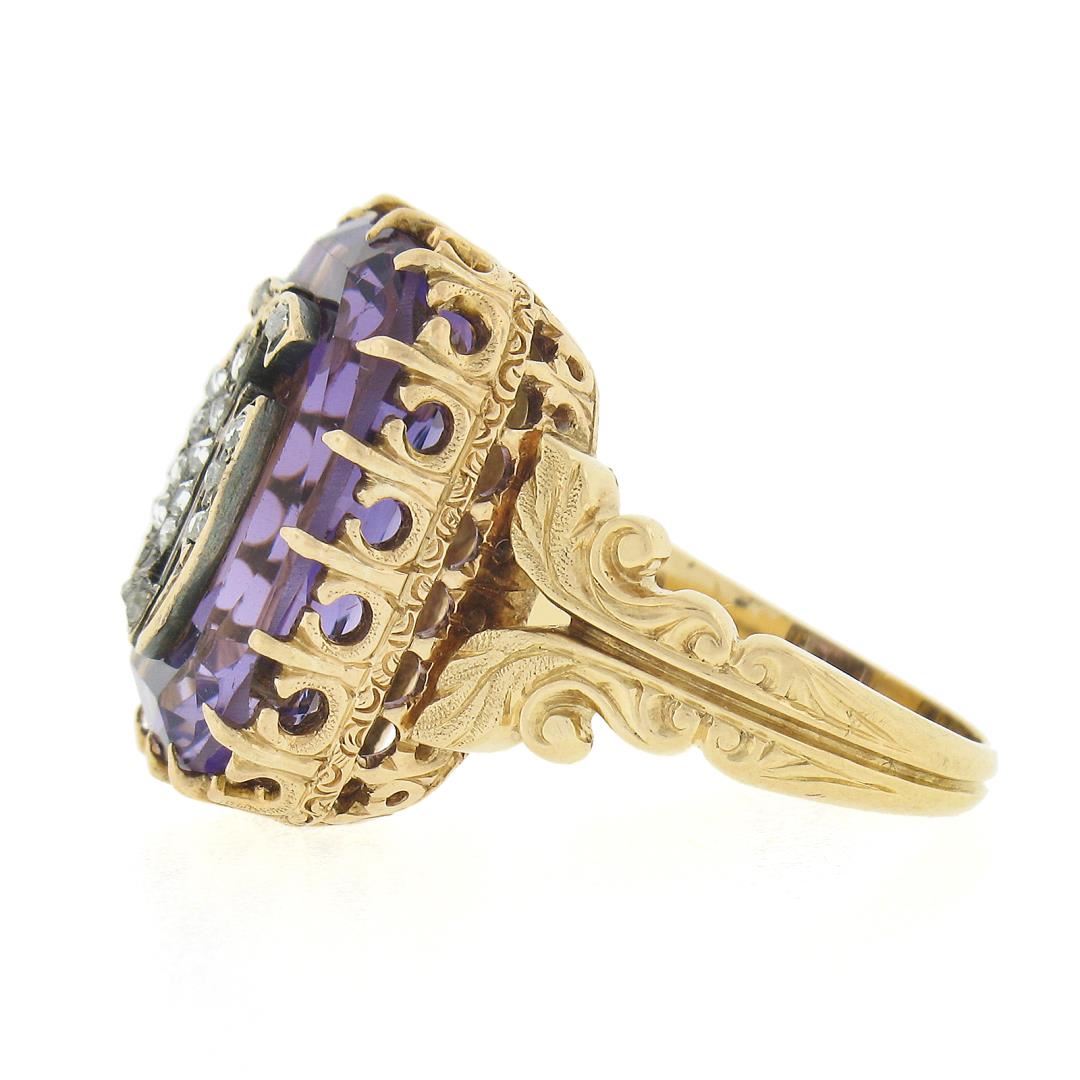 A vintage solid 18k yellow gold cocktail ring, with 1 elongated cushion cut natural amethyst (17.2x12.5mm), and 16 rose cut natural diamonds (H/I - SI1-I1 ; 0.30ctw). The ring is size 6.0, weighs a total of 9.53 grams, and measures 18.5mm wide.