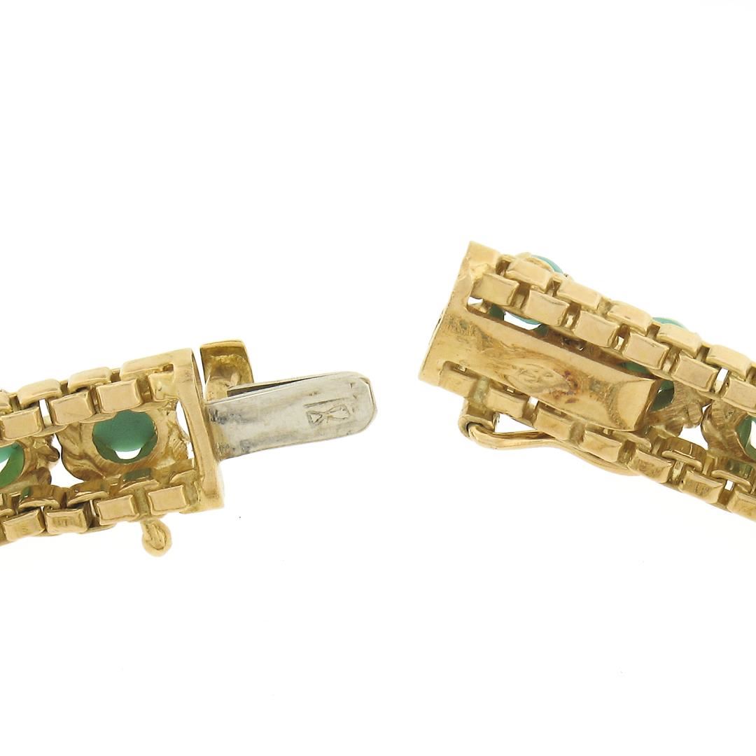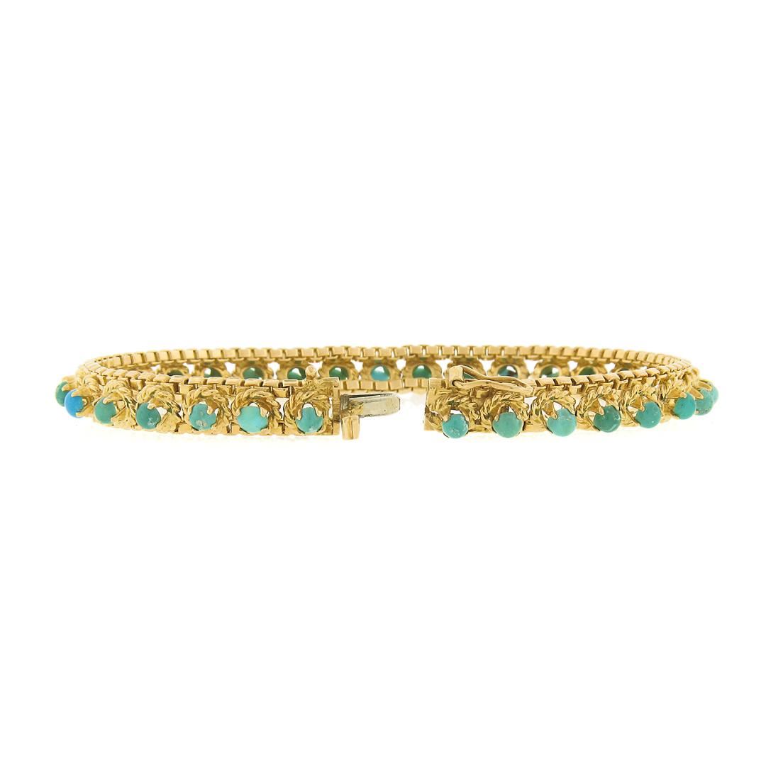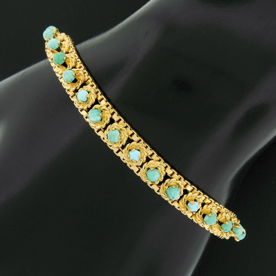A vintage solid 18k yellow gold bracelet, with 32 round cabochon cut natural turqusoises (2.8mm to 3.2mm each). It weighs a total of 21.26 grams, measures 6.9mm wide, and measures 6.5 inches in length.