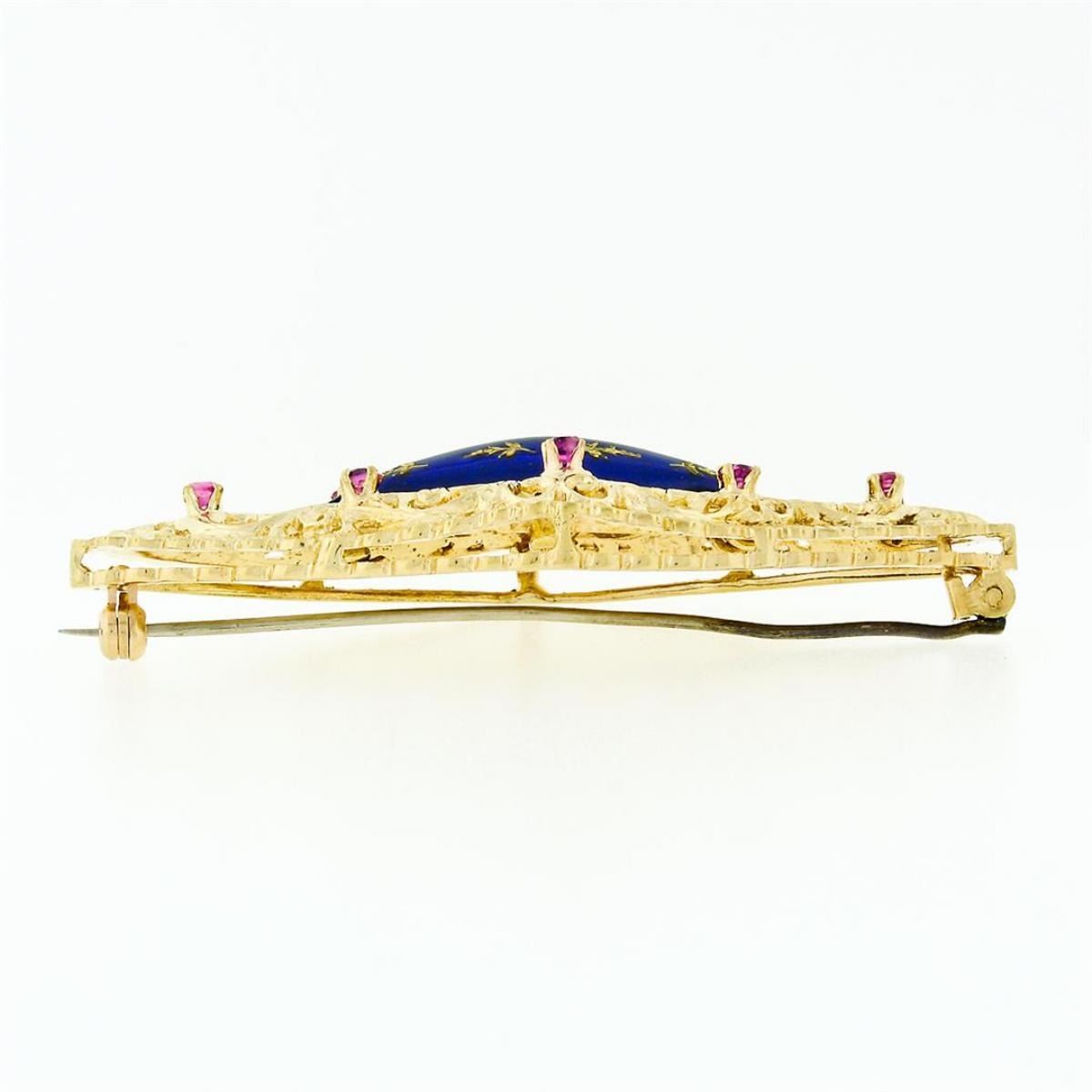A vintage 18k yellow gold filigree brooch with a blue enamel center surrounded by 8 round cut natural rubies (0.29ctw). Measures 24.32x56.37mm and weighs a total of 13.95 grams.