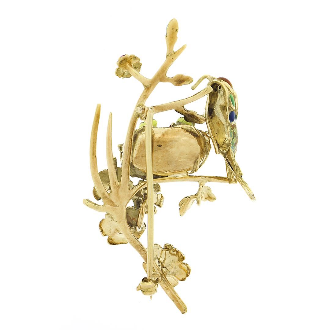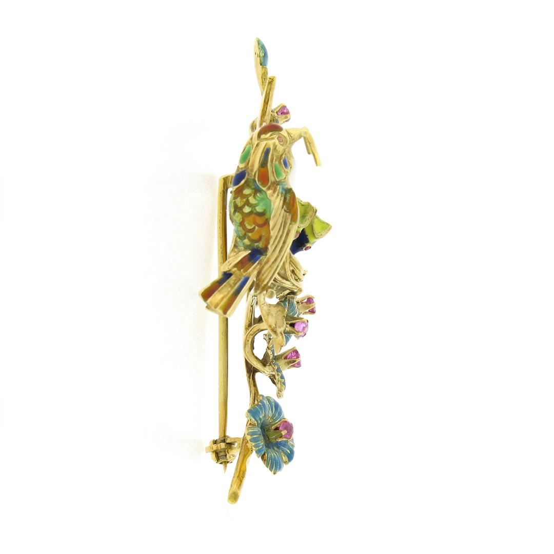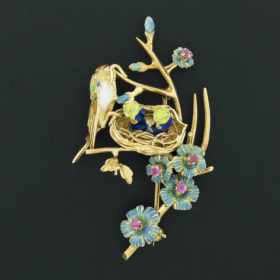 a vintage solid 18k yellow gold brooch, with enamel work & 5 round cut natural rubies (0.40ctw). Measures 31.70x55.10mm and weighs a total of 12.94 grams.