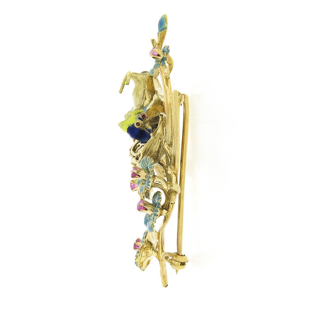 a vintage solid 18k yellow gold brooch, with enamel work & 5 round cut natural rubies (0.40ctw). Measures 31.70x55.10mm and weighs a total of 12.94 grams.