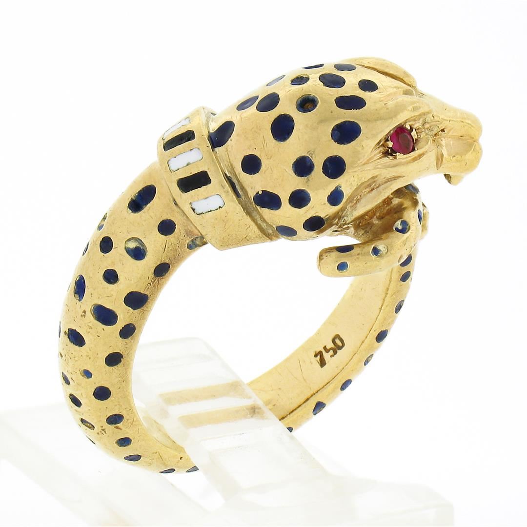 A vintage solid 18k yellow gold leopard ring with enamel work & 2 round brilliant cut natural rubies (0.03ctw). The ring is size 6.5, weighs a total of 12.37 grams, and measures 11.60mm wide.