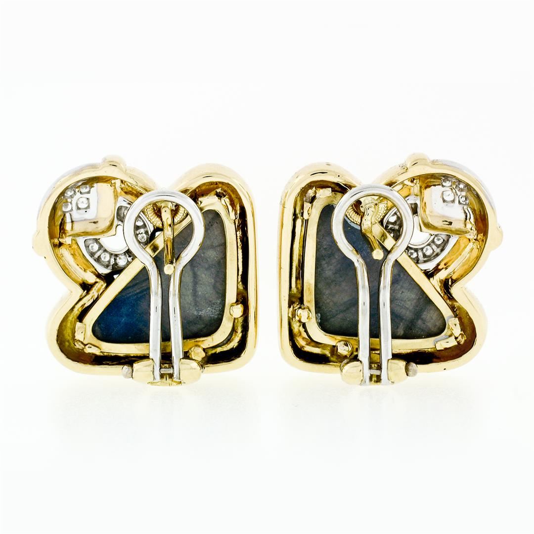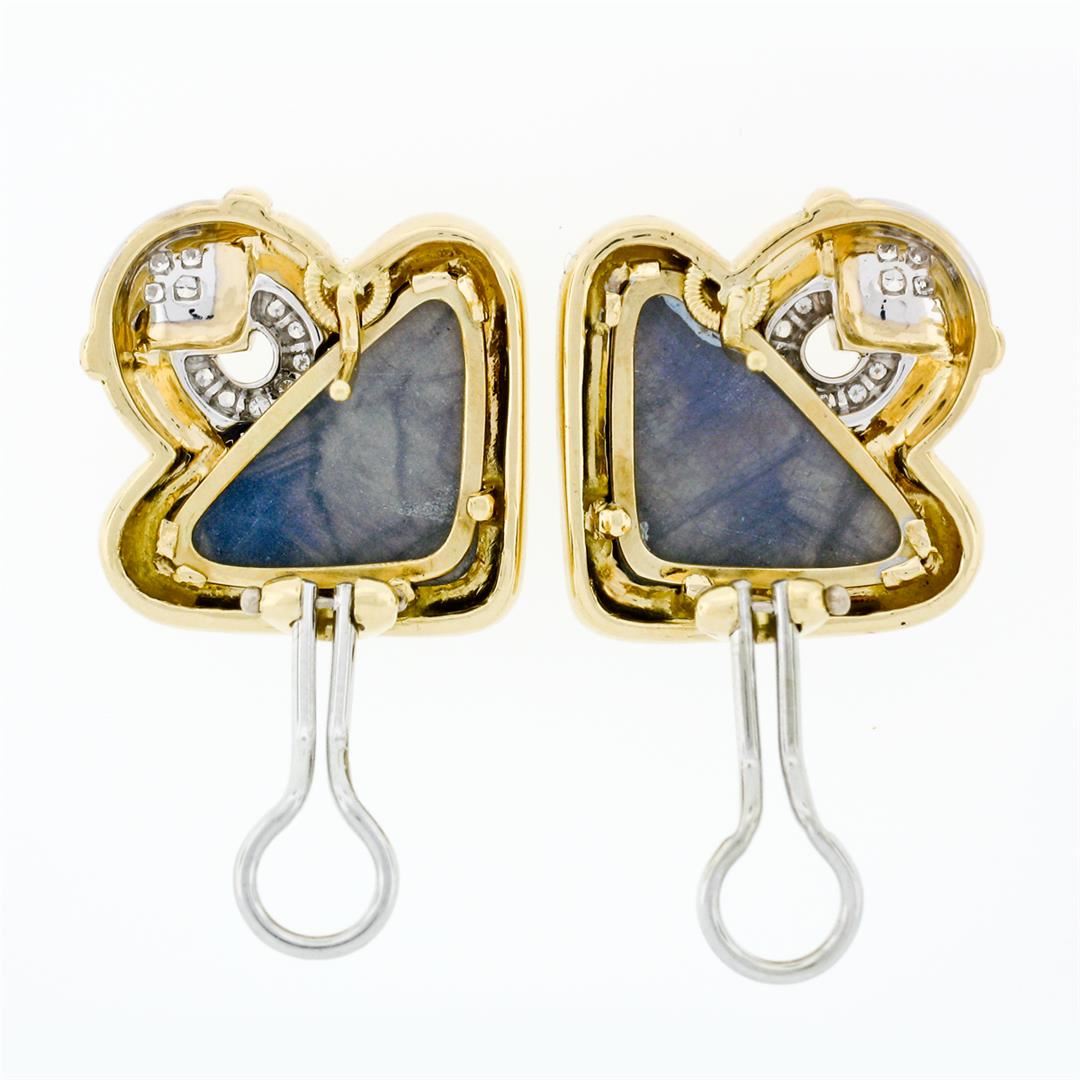 A pair of vintage solid 18k yellow gold earrings with 2 triangular natural sapphires (16.90x10.10mm) and 22 round brilliant cut natural diamonds (G/H - VS1/VS2; 0.30ctw). The earrings measure approximately 20.29x20.27mm and weigh a total of 19.22 grams.