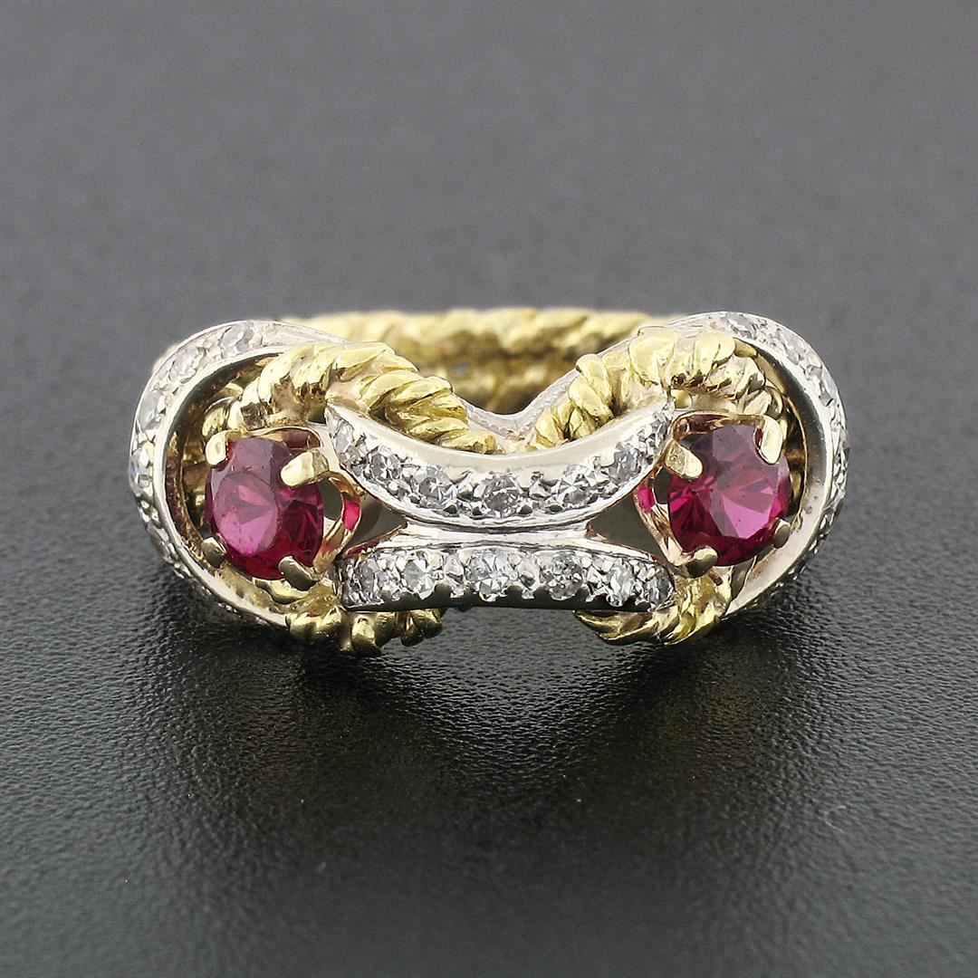 A vintage solid 18k yellow & white gold cocktail ring, with 27 old single cut natural diamonds (G/H- VS2; 0.27ctw), and 2 round brillaint cut red stones (4.1mm). The ring is size 6.5, weighs a total of 6.47 grams, and measures 9.5mm wide.